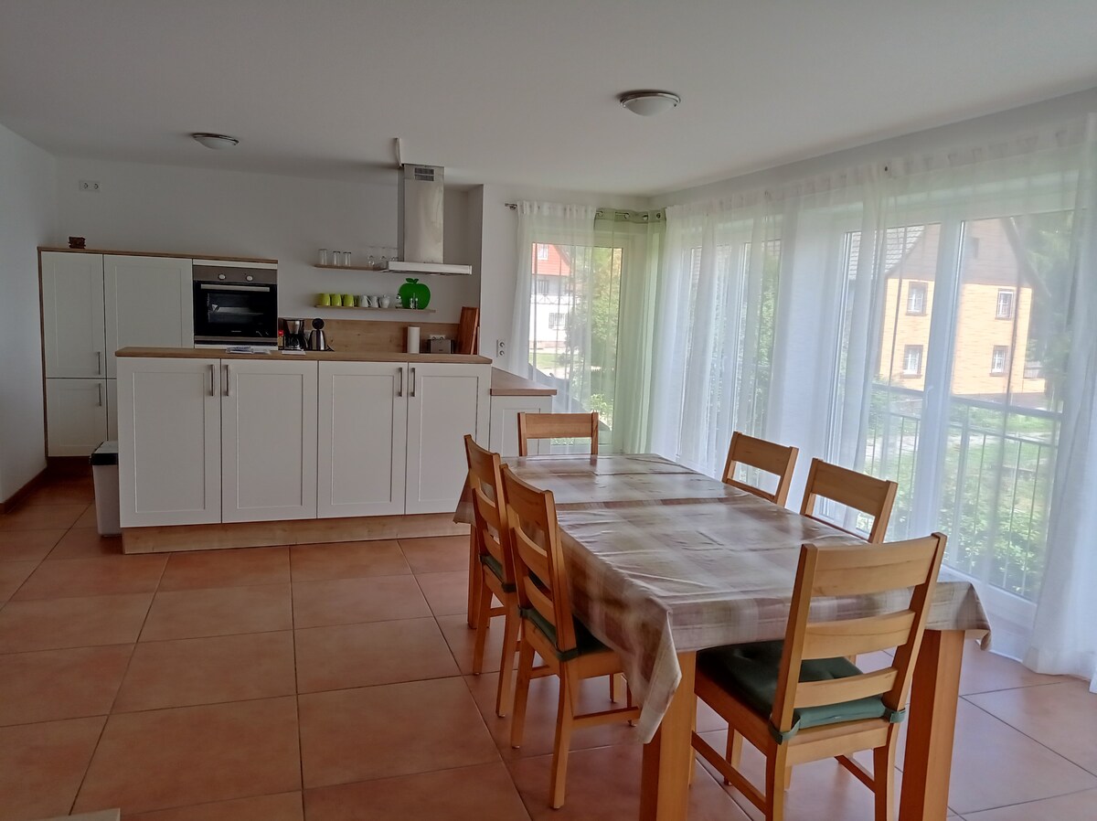 Wir vermieten eine neu ausgebaute Ferienwohnung,in einem ländlich gelegenem Dörfchen. Die Wohnung befindet sich in unserem Bauernhaus in dem wir selbst einen Wohneinheit bewohnen und das wir nach und nach ausbauen und renovieren. Es gibt einen separaten Eingang. Die Wohnung hat 1 Schlafzimmer, 1 Wohnzimmer, 1 Badezimmer und eine kleine Küche in der man sich super selbst versorgen kann. Parkplätze sind vorhanden. Ein WLAN Zugang steht zur Verfügung.