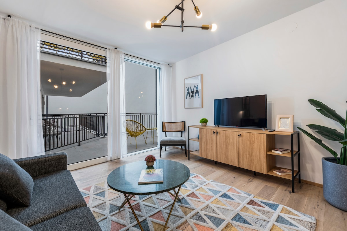 The apartment sleeps up to four people. There is a double bed in the bedroom and a pull-out sofa bed for two additional people in the 2nd bedroom which can also be used as an office. Besides that, the apartment offers a spacious living room with a dining area and a large kitchen. There is also a small balcony with a table and two chairs, overlooking a beautifully maintained courtyard.