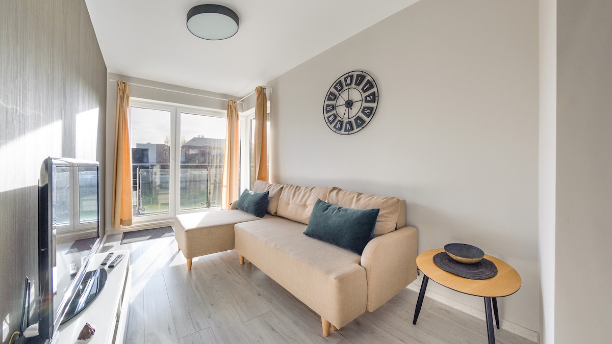 Przestronny 70-metrowy apartament na parterze w nowym budynku w Centrum Gdańska. Bezpłatne miejsce parkingowe w hali garażowej. Kilka minut drogi od Długiego Pobrzeża i Długiego Targu – po wyjściu z budynku widok na „Stary Żuraw”. Sklep spożywczy (Żabka) znajduje się w odległości 50 metrów od mieszkania. Duża kolekcja książek, gry planszowe, Lego, 2xTV.