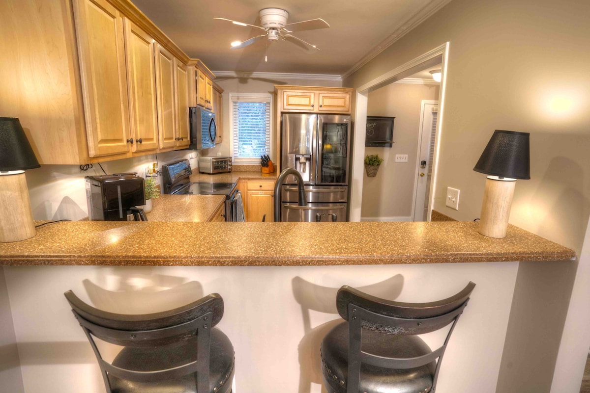Escape to this modern alpine townhouse with mountain views in downtown Helen. Relax in the private hot tub on one of the three decks that wrap around this quiet retreat. Enjoy your favorite beverage around the fire pit on the back deck while everybody helps whip up something tasty on the grill. Great meals are easy to do with the fully stocked chef's kitchen. After enjoying all the fun activities around Helen, visit some of the many wineries and breweries or the great North Georgia state parks!