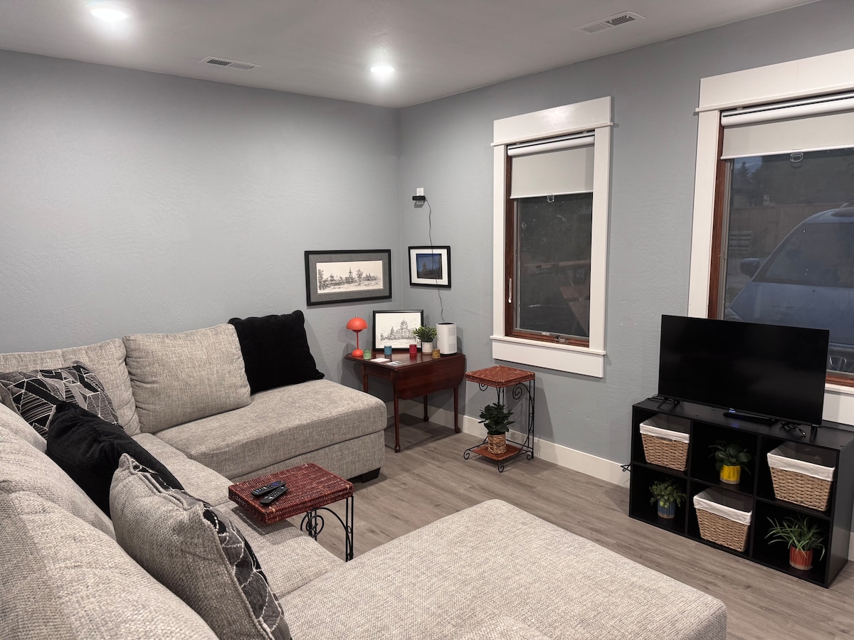 A recently remodeled mid-century guest suite in the heart of Helena. The suite features zero step entry, a queen size bed, closet space, high quality bedding, microwave, mini fridge, coffee pot, AC, and natural light throughout. A comfy, wide couch with bedding can be used in the living room for an extra bed. Brand new shower and replaced flooring in every room. Easy access to I-15, a quick drive to downtown Helena which is full of microbreweries, eateries and shopping, and close to the Capitol.