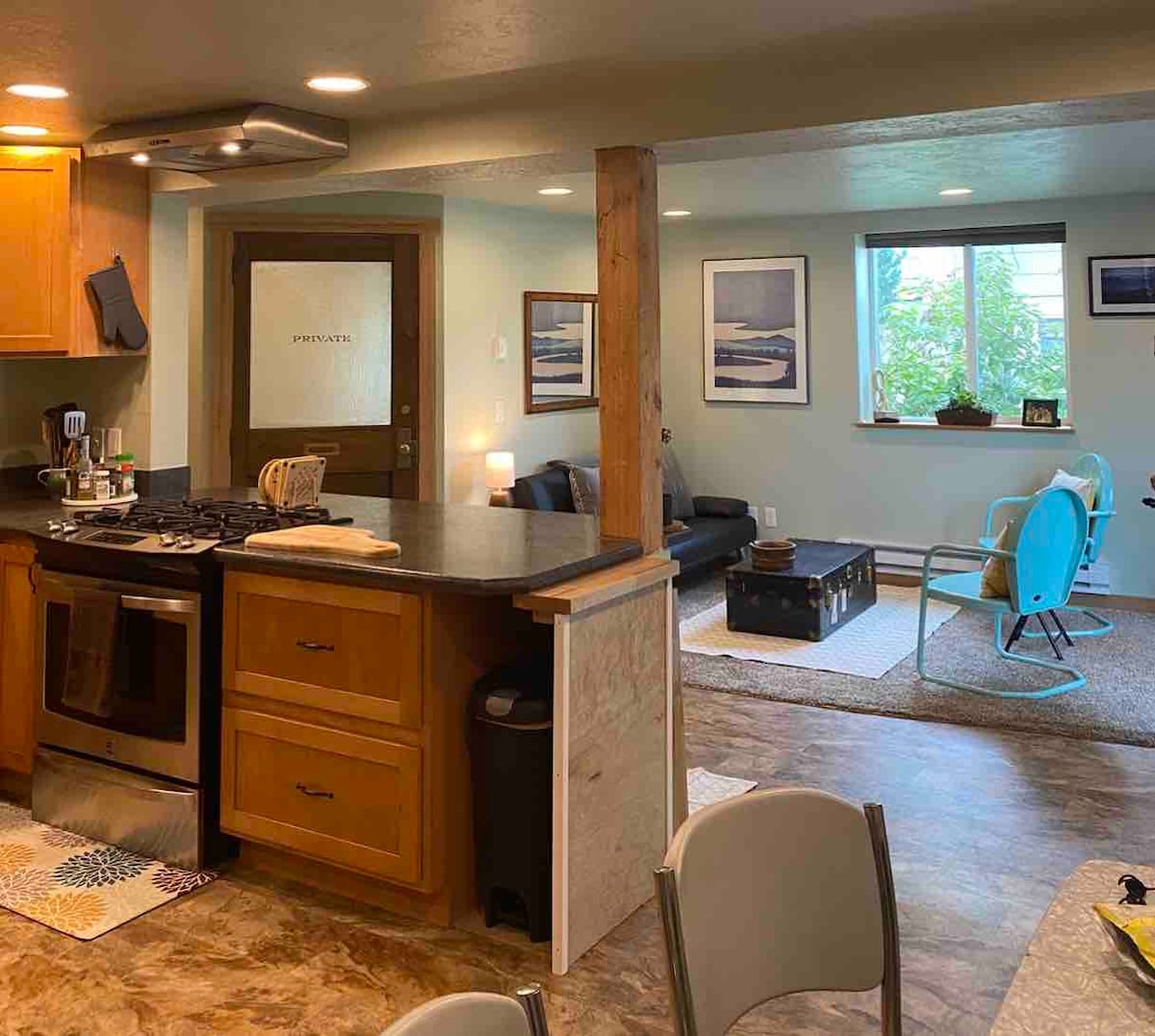 Newly renovated. Fiber internet. Self-check in/check out for a seamless way to unwind. Lots of natural light. Decorations with vintage flair, stocked coffee bar, full kitchen, and views of Mount Helena from the living room create a space you'll easily enjoy. Beds: Queen in the bedroom and a twin cot in the living room.