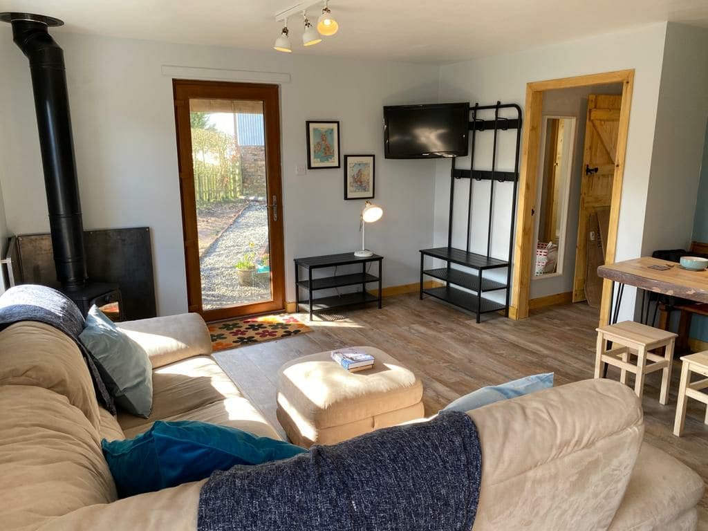 A cosy National Park hide-away surrounded by nature, wildlife and farm animals over the fence. Rustic comfort, ideal for hikers,travellers or remote workers looking for countryside, amazing mountain views and those big Scottish skies. Private location is accessed via a horrible rough farm track! King bedroom and bunkbeds in a tiny bedroom. Comfy corner sofa to relax, outdoor covered seating for star-gazing. Inside the Loch Lomond National Park. Calm, birdsong, walks and traditional pub. 2 desks