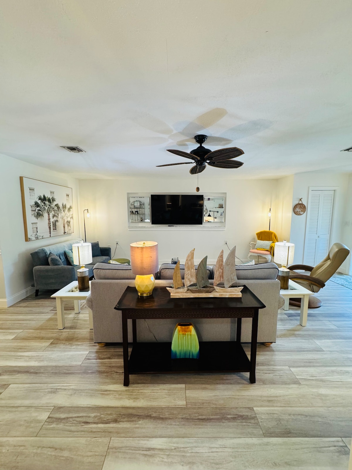 The price includes the cleaning fees per Airbnb. Less than a mile from the beach! Fully equipped kitchen. A living room, dining area, separate bedroom (queen bed) with full bathroom. AC, heat, hot water, Wifi, 2 TVs, private backyard with bbq grill, seating and your own designed parking spot, room for boat/jetski. The home is located close to highways, airports, golf courses, pickleball, tennis, beaches, restaurants, shopping, hiking, water sports, hospitals and more. *Dogs allowed with pet fee.