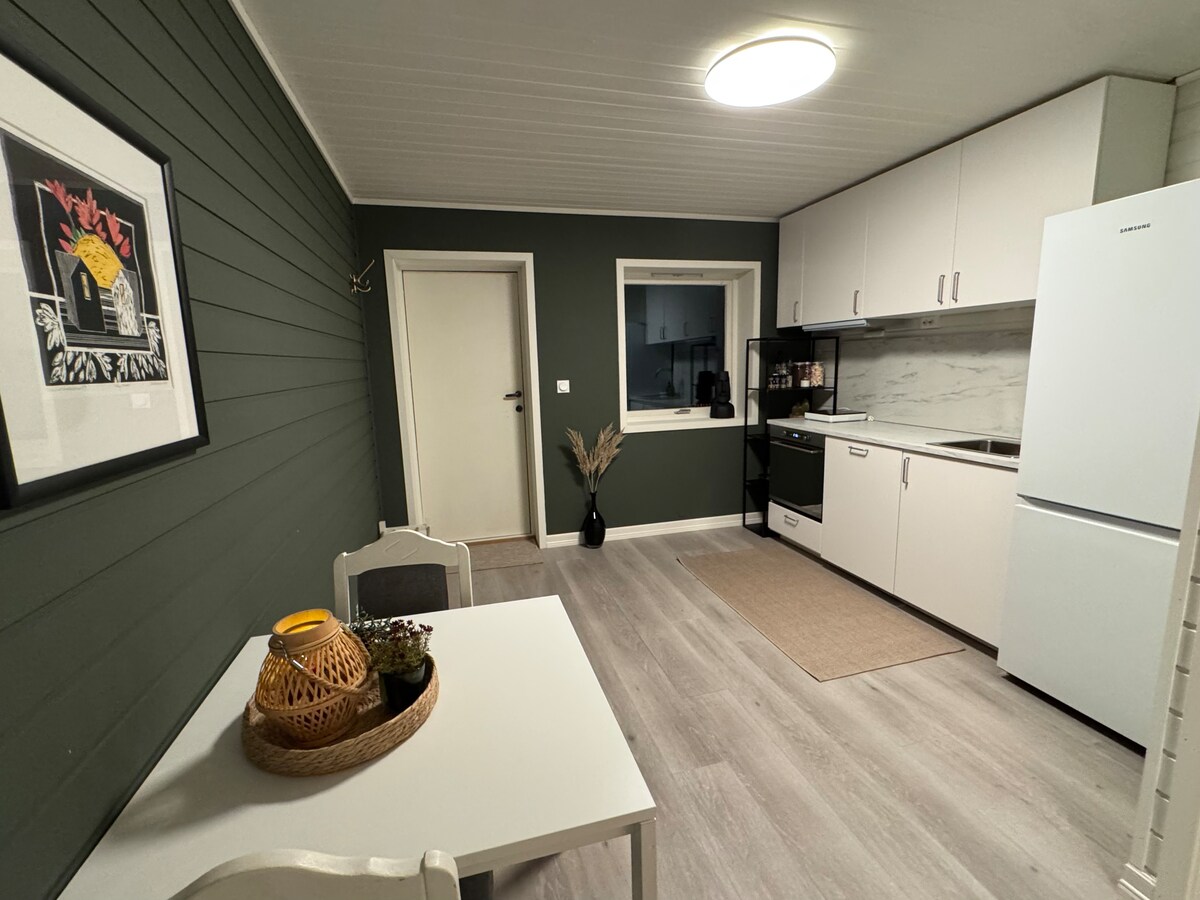 Our apartment (approx 30 m2) have a combined well equipped kitchen and living room with TV, fast internet connection and two good quality single beds. The apartment also has private entrance, a small hallway, and a nice bathroom with washing machine. Be aware that this is a basement apartment, with lower ceilings. Steps can be heard from above during daytime. Parking available.