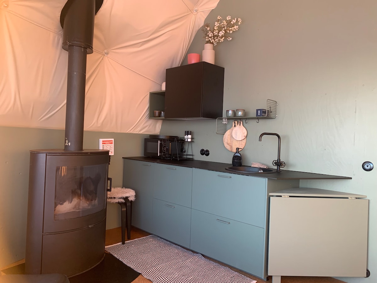 Experience unparalleled luxury and comfort at a black sand beach with beautiful views all around. There is a fully equipped kitchen and bathroom in our shared service house on the property, about 200m from the dome, as well as toilet cabins in a short walking distance from the dome.