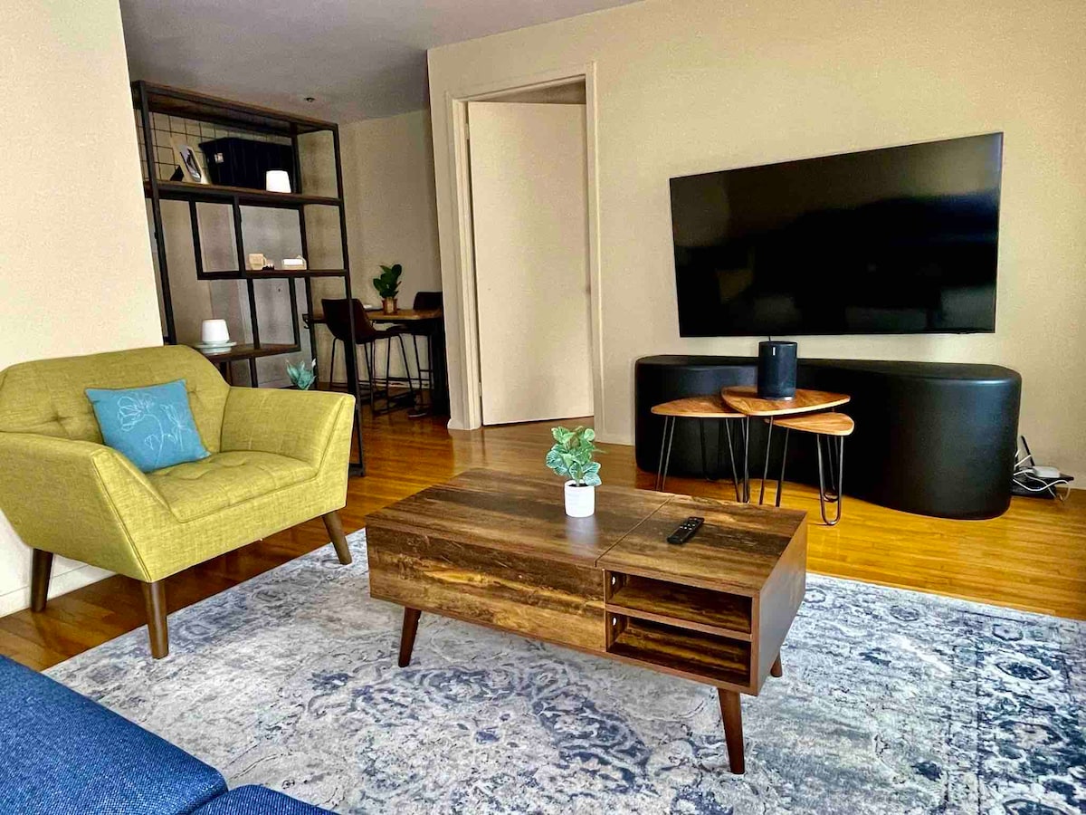 NYC-themed 2nd-floor apartment, just one easy flight of stairs up! Manhattan bus stop within steps—reach NYC in 10–20 mins. Features a cozy queen bed, full-size sleeper sofa-bed in the living room, and a twin sleeper chair-bed in a room next to the main bedroom. Ideal for 3–4 guests, plus infant/toddler accommodations. Surrounded by restaurants, shops, and salons—everything you need just steps away! We can provide a visitor's public parking pass if you do have a car.