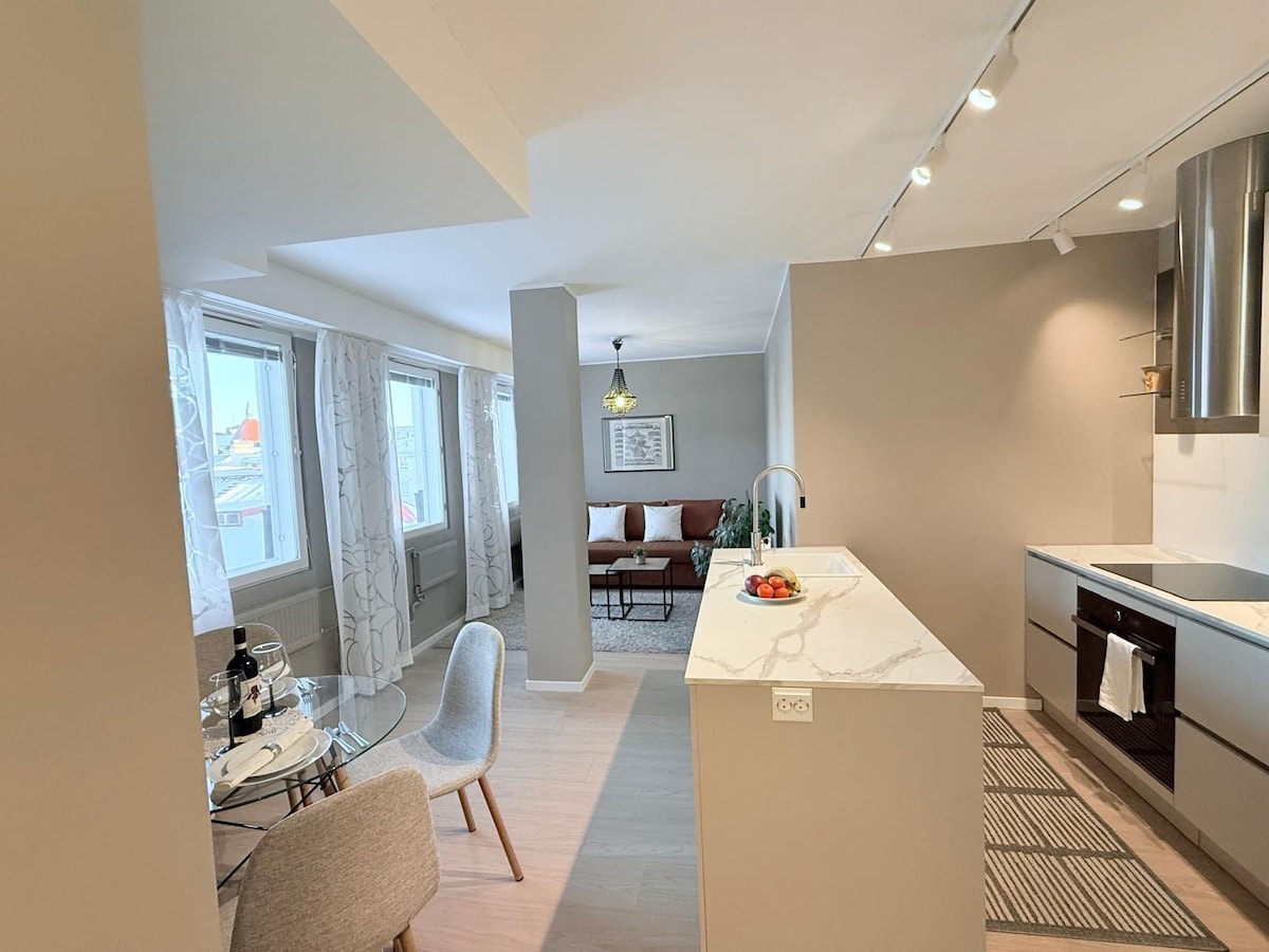 Experience Penthouse living in central Helsinki. Enjoy glassed-in balcony – warm even in early Spring if sun shines. Relax in the sauna, dine & lounge on the balcony while enjoying breathtaking archipelago scenery. A rare gem combining central city vibes, seaside charm, and views to the nature — completing your ultimate Helsinki experience. ✔ Flexible check-in Gym 🛏 2 BR 🅿 Free Parking (EV) 📺 70" Disney+ ⌘12 min to center 👣 Walkable 🏪 Grocery 60m, 24/7 🍕 Good restaurants Park