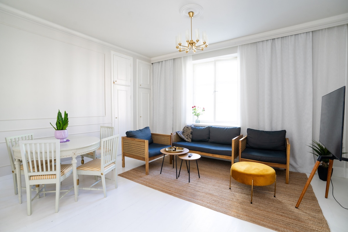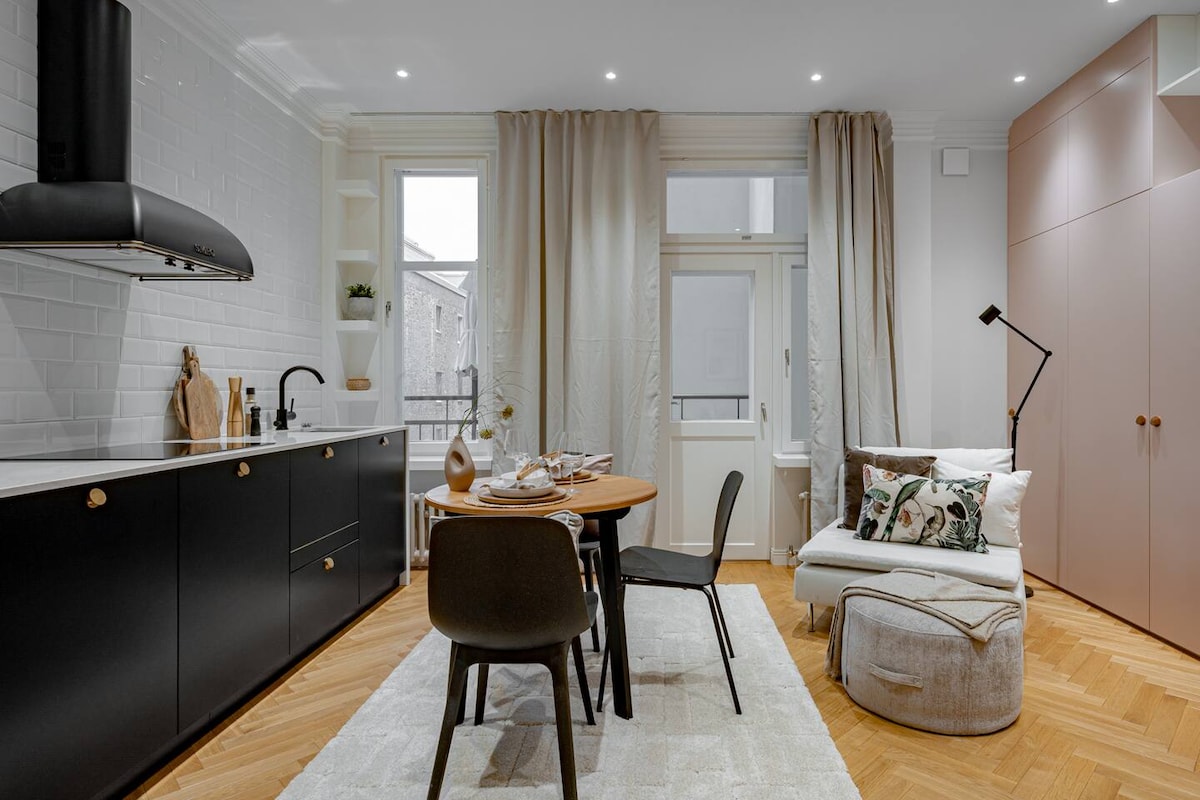 This furnished spacious studio apartment comes with warm colors and a fully equipped open layout kitchen. This studio is well suited for short and long term stays with a spacious layout, large Jugend-style windows, and plenty of closet space. Get the practical things like a fully equipped kitchen, washing machine, fast WiFi, 24/7 support, and regular professional cleaning, and fun stuff like a smart TV. Stay in comfort for as long as you’d like – days, weeks or months.