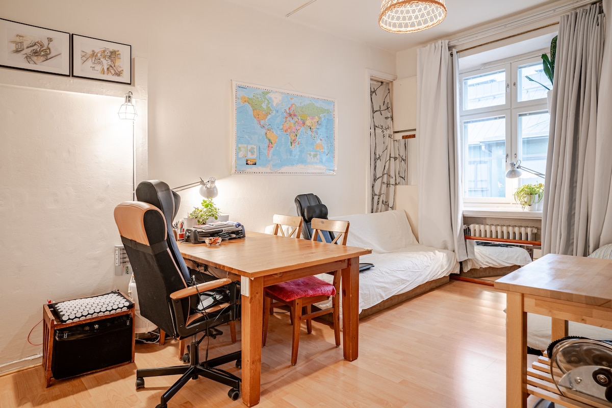 Cozy place in most beautiful and peaceful neighbourhood! 2 blocks from sea & park. Bathroom newly renovated (2024). Scenic 15 min walk to center and tram/ bus/ citybike. Two airy rooms all to yourself. High ceilings and windows. Quiet, harmonic. Well equipped kitchen. King size bed. You won’t find a quieter bedroom! Top fourth floor in Art Nouveau building. Islands, cozy restaurants, design district, boutiques nearby. No elevator. Fast internet. Grocery store 2 min. Happy to help!