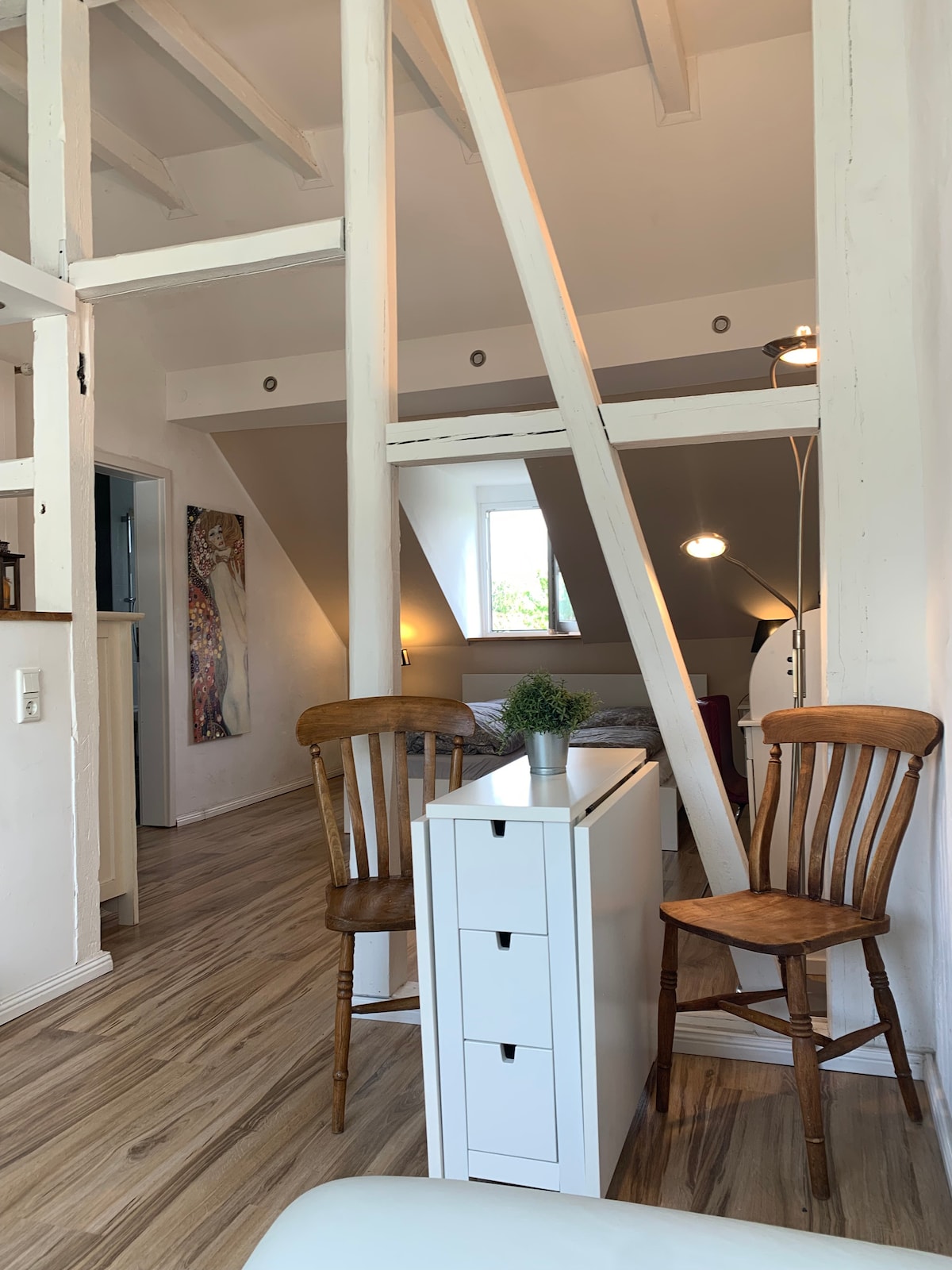 Das moderne Appartement im DG ist sehr zentral und ruhig gelegen. Es hat eine komplett ausgestattete Wohnküche, einen Essbereich, einen Schlafbereich für 2 Personen, Hintere Schlafbereich Deckenhöhe 175cm. Zusätzlich in der Wohnküche ausziehbare Schlafcouch . ein eigenes Duschbad. Im Wohn/Essbereich befindet sich ein Flachbild–TV und WLAN kann bereit gestellt werden. Optimal für 2 Personen