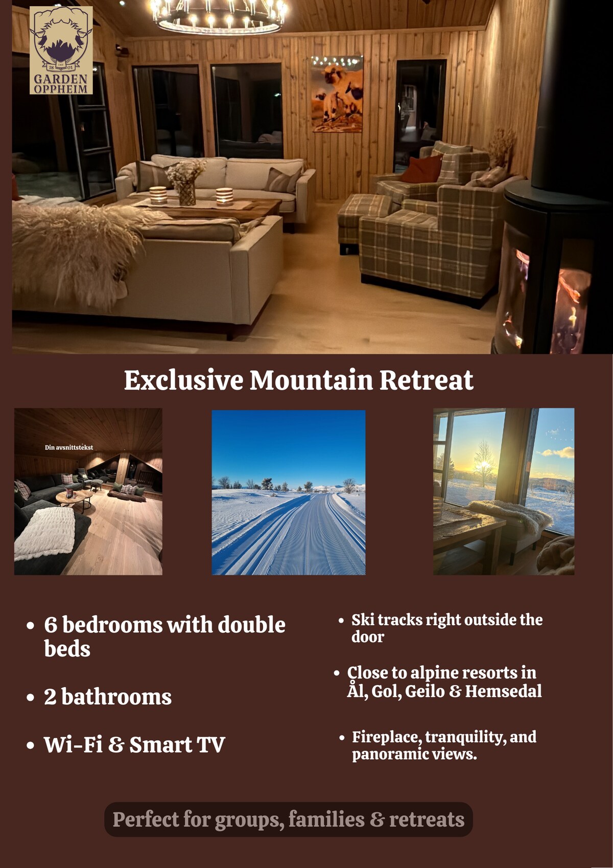 Nyt en stilfull opplevelse på et sted med sentral beliggenhet i Hemsedal som ble kåret til et av Europas 10 beste skidestinasjoner i 2023. Hytten ble bygget i 2023, er svært påkostet og med luksuriøse detaljer. Beliggenheten er helt unik ved siden av det trendy Fyri hotell og med under 2 minutters gange til tilbringerheisen. Hytten har 4 romslige soverom, 3 av dem med 180 cm brede senger, et av dem med 160 cm seng. I tilegg er det en tilhørende stue til det ene soverommet med en sovesofa (150)
