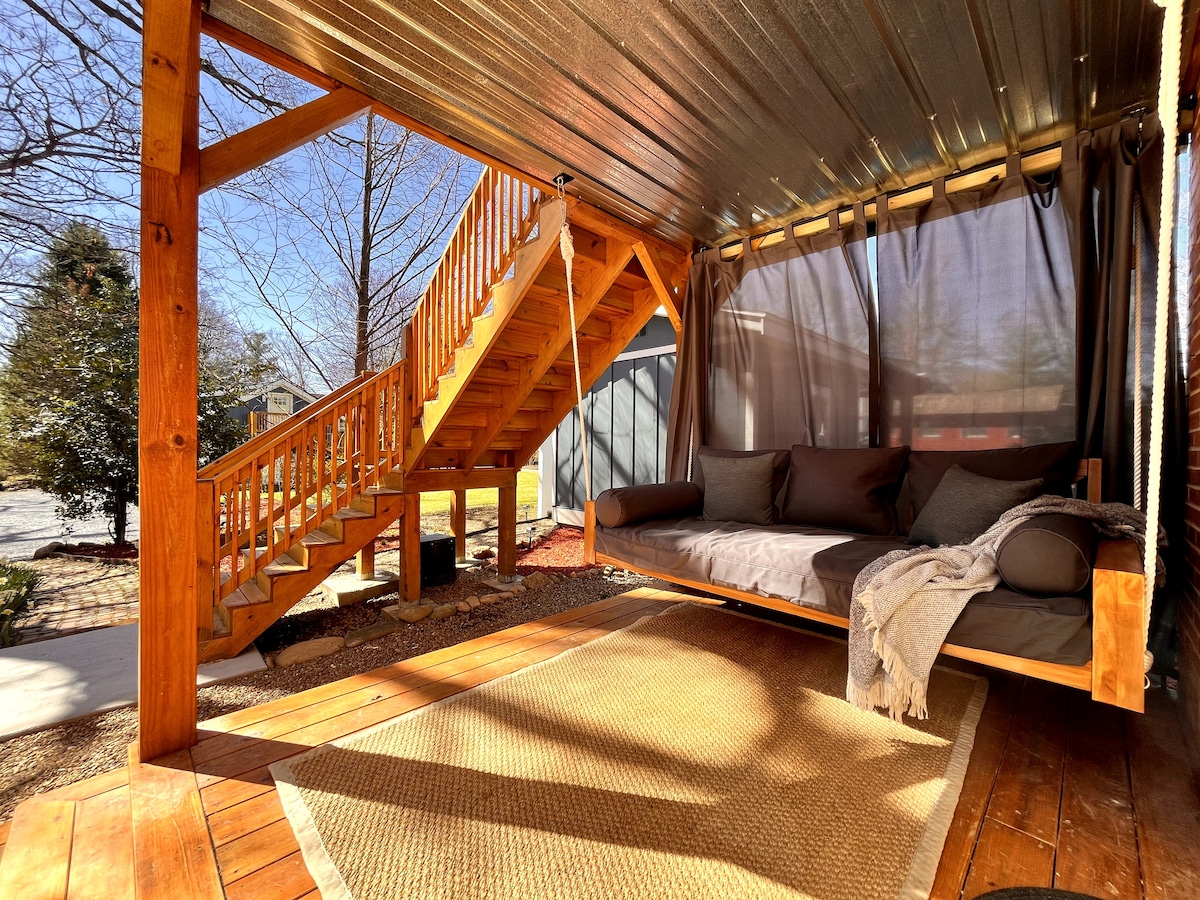 Enjoy all the outdoor adventures Asheville has to offer while staying in the Scandinavian-styled tiny house situated on 50 acres of farmland and forest. Directly across the French Broad River from Sierra Nevada Brewing and just 15 minutes from Asheville Regional Airport, you can enjoy uninterrupted views of the farm while roasting marshmallows and enjoying a glass of wine on your private deck.