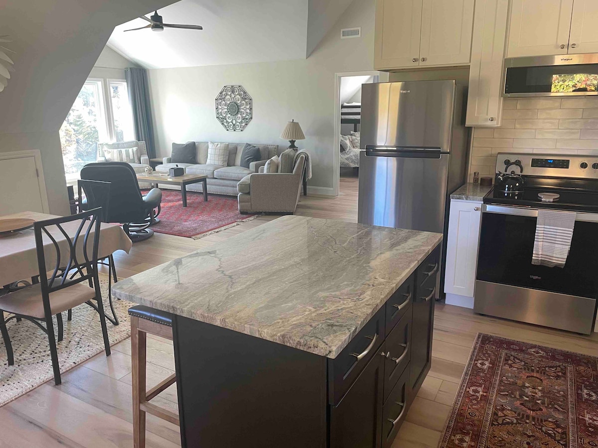 Welcome to our cozy studio complete with a private entrance. The kitchen is fully equipped with a full-size fridge, stove, microwave, and Keurig, and the king-size bed features a medium-firm mattress for a restful night's sleep. This studio is in our basement. You might hear our dogs or footsteps sometimes since our bedrooms are right above. We do our best to keep noise down, especially when we’re home. We can't wait to host you & making your stay as comfortable as possible!