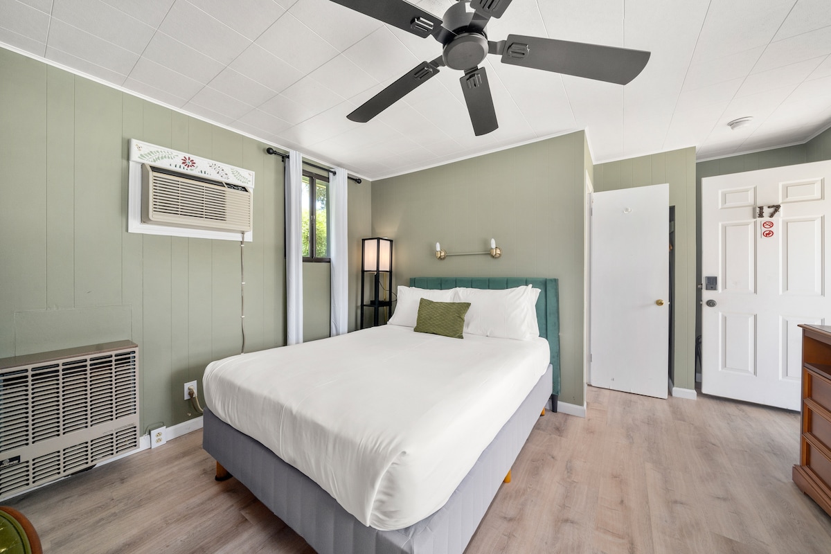 Traditional hotel accommodation that includes a king bed, private bathroom and air conditioning/heating. These rooms feature a shared balcony with the adjacent room that overlooks into a courtyard area or a parking lot. Our hotel rooms do not have a view of the lake. Please note there is not a TV in the room.