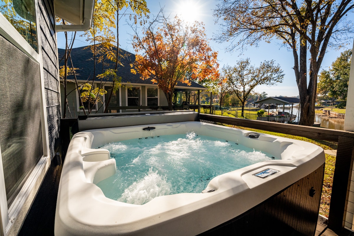 Stylish, newly remodeled lake house with private dock and hot tub. This beautiful home offers a spacious common area for gatherings, a Chefs' kitchen with island, dining and living room. The Main house has 3 bedrooms/2 baths. The separate bunkhouse next door has a media room with a large screen TV , video games and exercise equipment! Enjoy the incredible views of the lake from the patio or in the hot tub! A lily pad, kayaks and a paddle boat are also available for use during your stay.