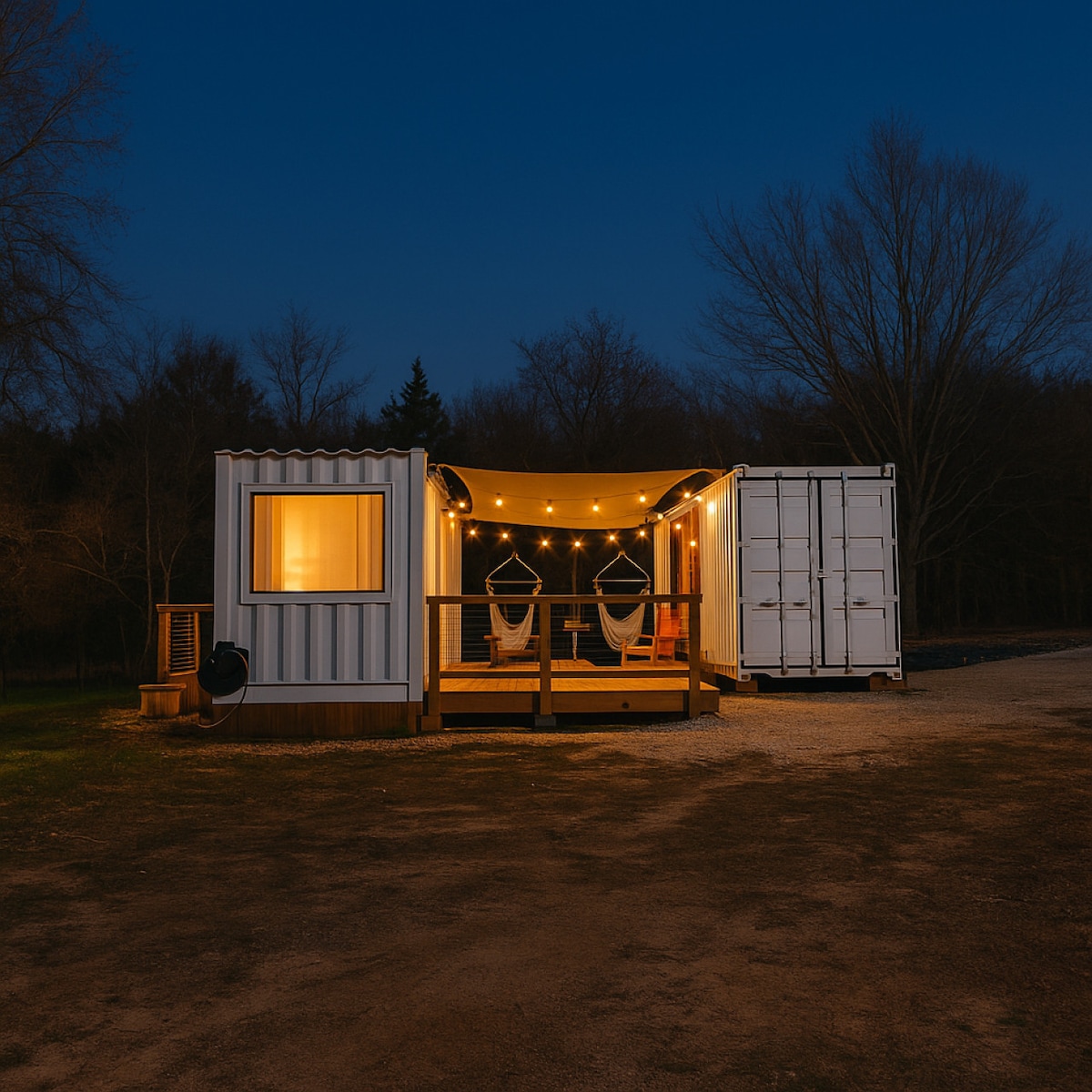 A bold, off-grid shipping container retreat on your own private 100 acres. Enjoy an outdoor rain shower, private hot tub, full outdoor kitchen, hammock lounge, and peaceful stargazing nights. No neighbors. No distractions. 🔥 Outdoor Experiences Private 100-acre property — no neighbors in sight Outdoor rain shower Private hot tub (open year-round) Fire pit w/ seating Outdoor dining area + grill setup Sun loungers Starlit nights perfect for photos + stargazing apps