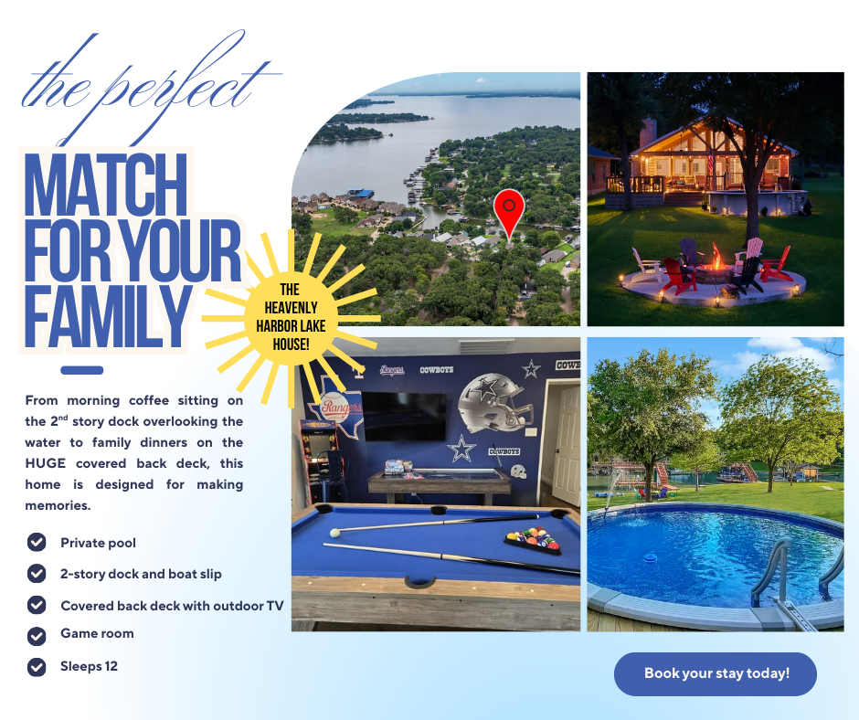 Welcome to Heavenly Harbor, the perfect getaway with your loved ones! Experience first class accommodations at our home that sleeps up to 12 guests and has an oversized lot with direct lake access. Enjoy: • Private Swimming pool • HUGE covered back deck (new addition!) • Outdoor TV • Fire pit • 2 story dock • 2 kayaks & canoe • Retro Nintendo • Pac-Man Arcade Game • Game room with mounted TV, pool table, air hockey table, pub table, and recliner. • BBQ Grill • Floating Lily Pad • Yard Games