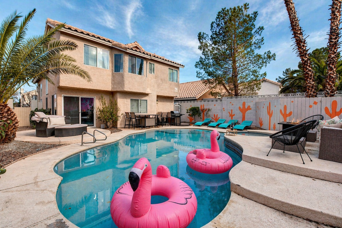 Consistent 5⭐ and Guest Favorite for a reason! With this house you get 15 beds, heated pool, hot tub, pool table, chef's kitchen, mini golf, arcades & games, 10 smart TVs, BBQ, and more! This big, well-appointed, resort-style home can host your entire group under 1 roof comfortably. You'll be the hero of your group for booking. And it’s less than 10 minutes from The Strip or Fremont Street! Perfect for family reunions, business travelers, or wedding groups. Book now before dates are taken!