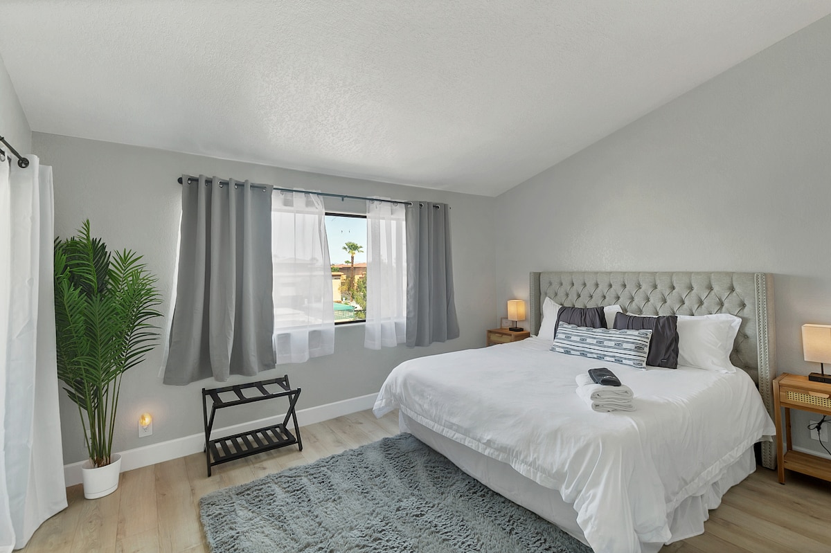 Unwind in our stylish 2-bed retreat featuring high-vaulted ceilings, a 65-inch TV, spa-like bath, and premium mattresses on a king and queen bed. Enjoy two outdoor patios and convenient parking right in front of the unit. Access to outdoor pool, hot tub, gym, and tennis courts in a gated setting. The ideal location puts you close to restaurants, shopping, hiking trails, and the strip. Immerse yourself in the perfect blend of modern comforts and cozy elegance. Book now for an unforgettable stay!