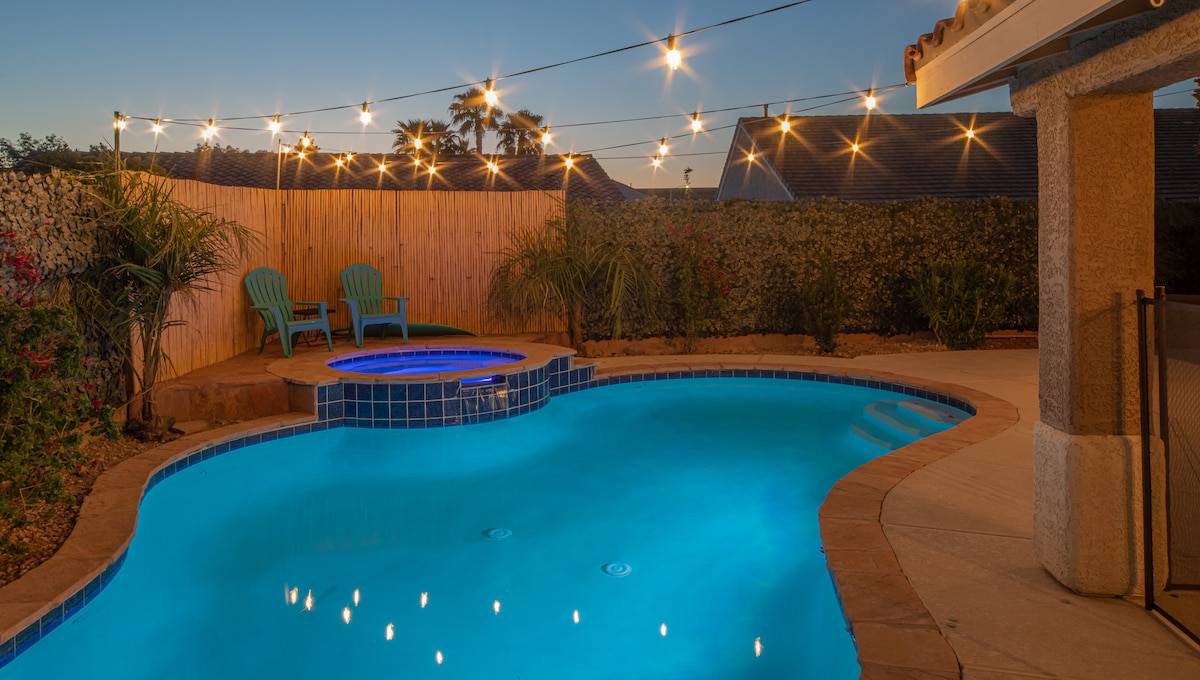 Escape to our 1-acre desert oasis in Las Vegas! Our home offers a unique blend of coziness and excitement, with a balcony boasting stunning mountain views and a glimpse of the vibrant Las Vegas Strip. 1200 sqft of living space for up to 4 person, 22’ pool 4’ depth with slide, Pickleball and basketball Enjoy a short par 3 golf course right in your backyard, . Experience the magic of the desert landscape, just a short drive from the bustling Strip. Your adventure awaits here in this desert haven
