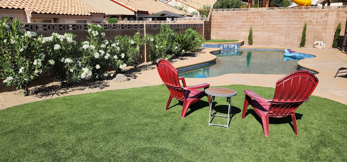 Looking for the perfect home to accommodate your group? Look no further; our sunny oasis awaits! Our spacious home, nestled in the Henderson neighborhood just outside Las Vegas, is the perfect group getaway. You can take a trip up to the Strip, or enjoy our sparkling swimming pool, multiple Smart TV's with major streaming sites, and BBQ in our private backyard. Surrounded by stunning golf clubs and restaurants, our beautiful three-bedroom home was intentionally designed for you!!