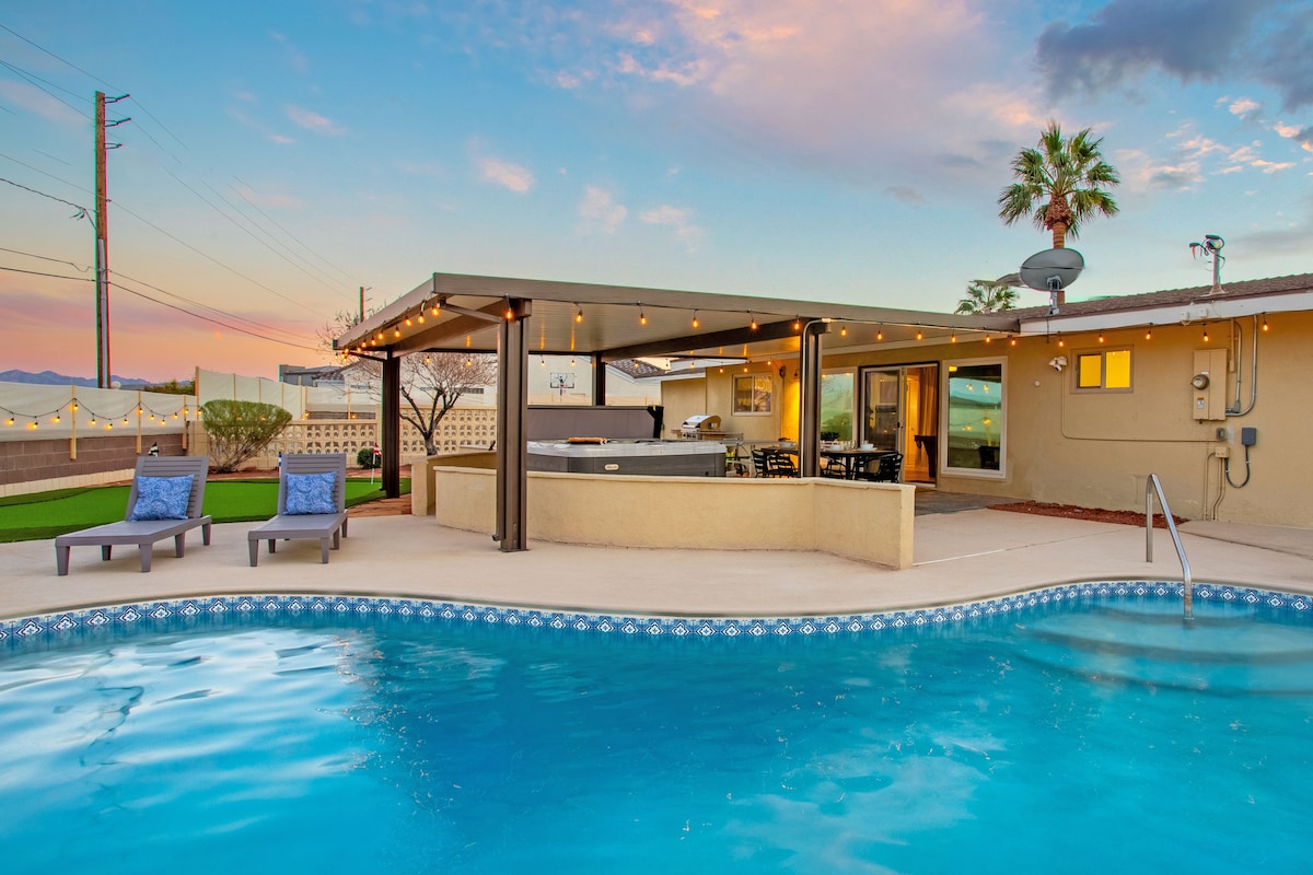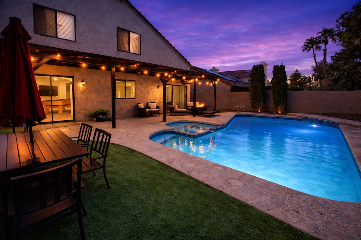 Looking for the perfect home to accommodate your group? Look no further; our sunny oasis awaits! Our spacious home, nestled in the Henderson neighborhood just outside Las Vegas, is the perfect group getaway. You can take a trip up to the Strip, or enjoy our sparkling swimming pool, multiple Smart TV's with major streaming sites, and BBQ in our private backyard. Surrounded by stunning golf clubs and restaurants, our beautiful three-bedroom home was intentionally designed for you!!