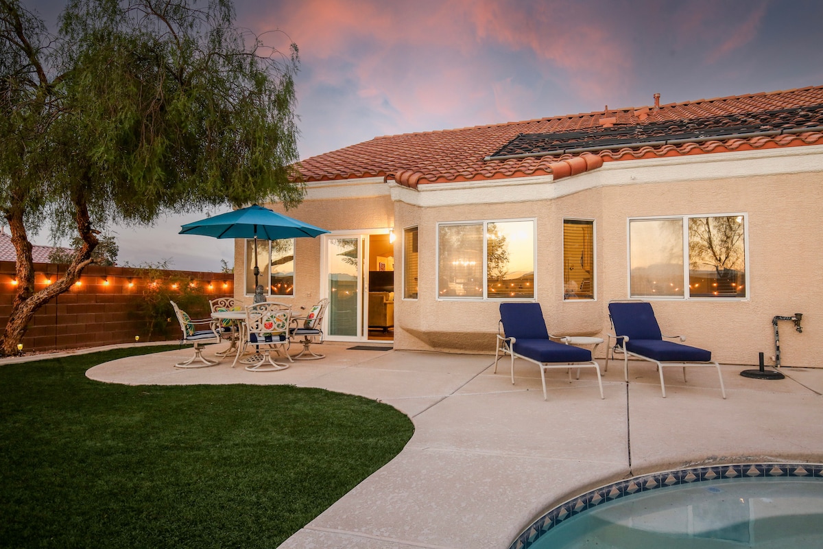 Looking for the perfect home to accommodate your group? Look no further; our sunny oasis awaits! Our spacious home, nestled in the Henderson neighborhood just outside Las Vegas, is the perfect group getaway. You can take a trip up to the Strip, or enjoy our sparkling swimming pool, multiple Smart TV's with major streaming sites, and BBQ in our private backyard. Surrounded by stunning golf clubs and restaurants, our beautiful three-bedroom home was intentionally designed for you!!