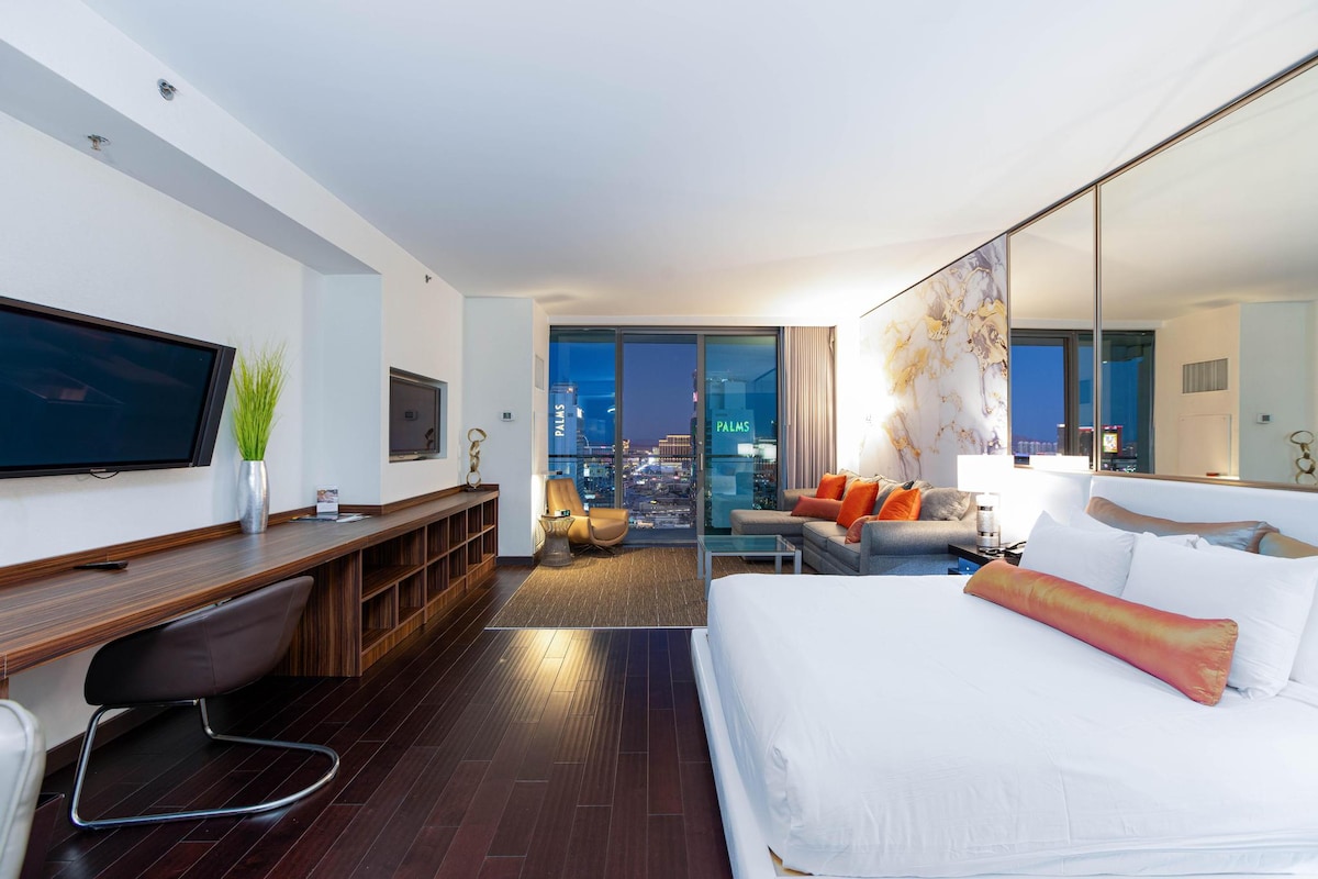 NO RESORT FEE. NO CLEANING FEE. Palms Place Hotel and Spa feels more like a home than a hotel. Removed from the non-stop action of the casinos. Four diamond luxury studio living at Palms Place is a case study in what contemporary luxury is all about. 615 sq feet of living space with living room, counter height dining table, kitchenette. A full size balcony patio with Strip, City and Mountain views attached to the unit is available for all guests. Palms hold card $100/night, removed upon checkout