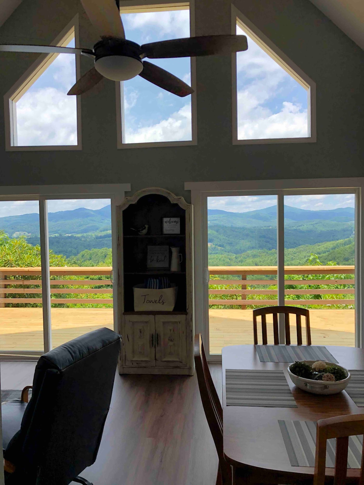 Stunning villa, perched atop a mountain, surrounded completely by other mountains. An expansive deck was designed and furnished intentionally to allow for guests to enjoy the LONG RANGE VIEWS from various angles. This Frank Lloyd Wright inspired villa takes the "city vibe" into the woods, with large windows bringing in light and showcasing the beautiful natural setting. Interior features are open, uncluttered, and incredibly comfortable, with quality at the forefront of our minds in this space.