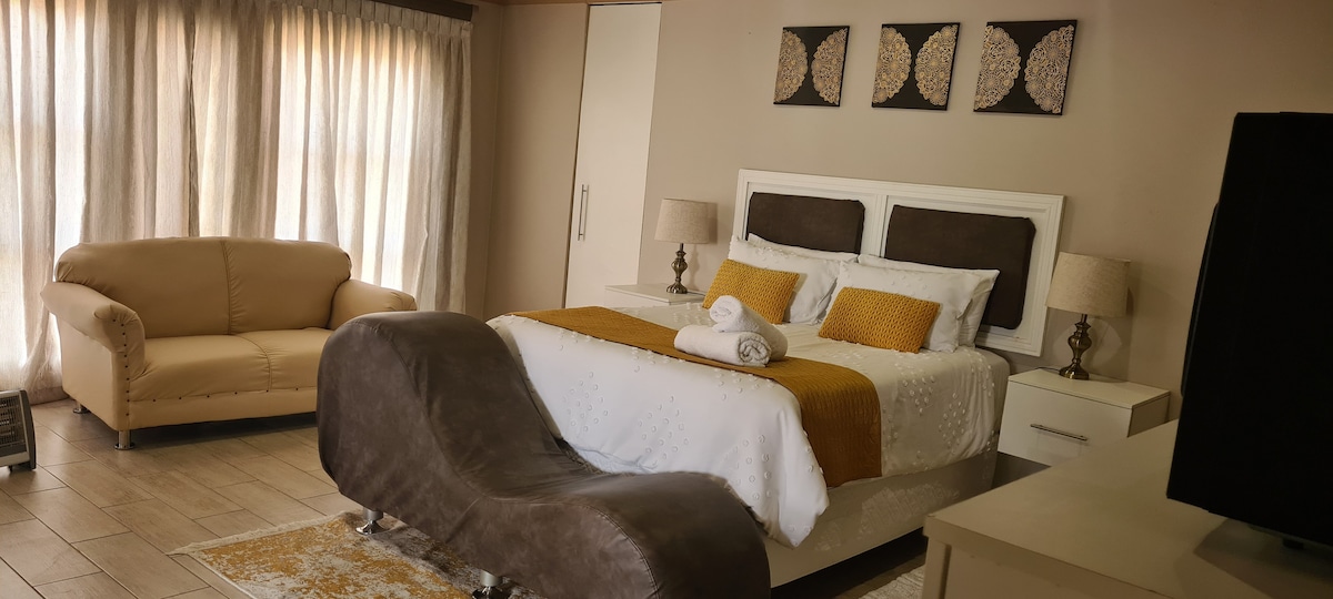 This self-catering room features 2 single beds or 1 king size bed equipped with an electric blanket. The room has an en-suite bathroom and there is a basic kitchenette that is equipped with a fridge, a microwave and basic utilities. The unit includes a 32-in flat-screen TV with premium DStv channels. A private patio has its own braai area. The unit has a hair-dryer and an iron.