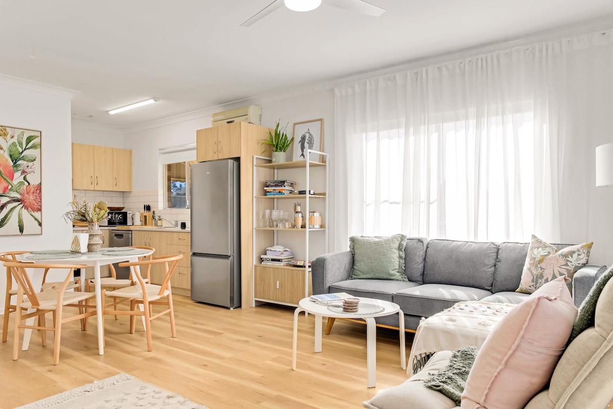 Perfect relaxation in the seaside suburb of Grange. Our charming, newly renovated one-bedroom apartment (sofa bed available if more than 2 guests) is situated within easy reach of Liv Golf, Fringe festivities, pristine beaches, Grange Jetty and bustling Henley Square. Modern amenities and coastal charm await with a fully-equipped kitchen and direct access to the shared pool. We understand your pets are part of the family, so they are very much welcome too, in a fully secured back yard.