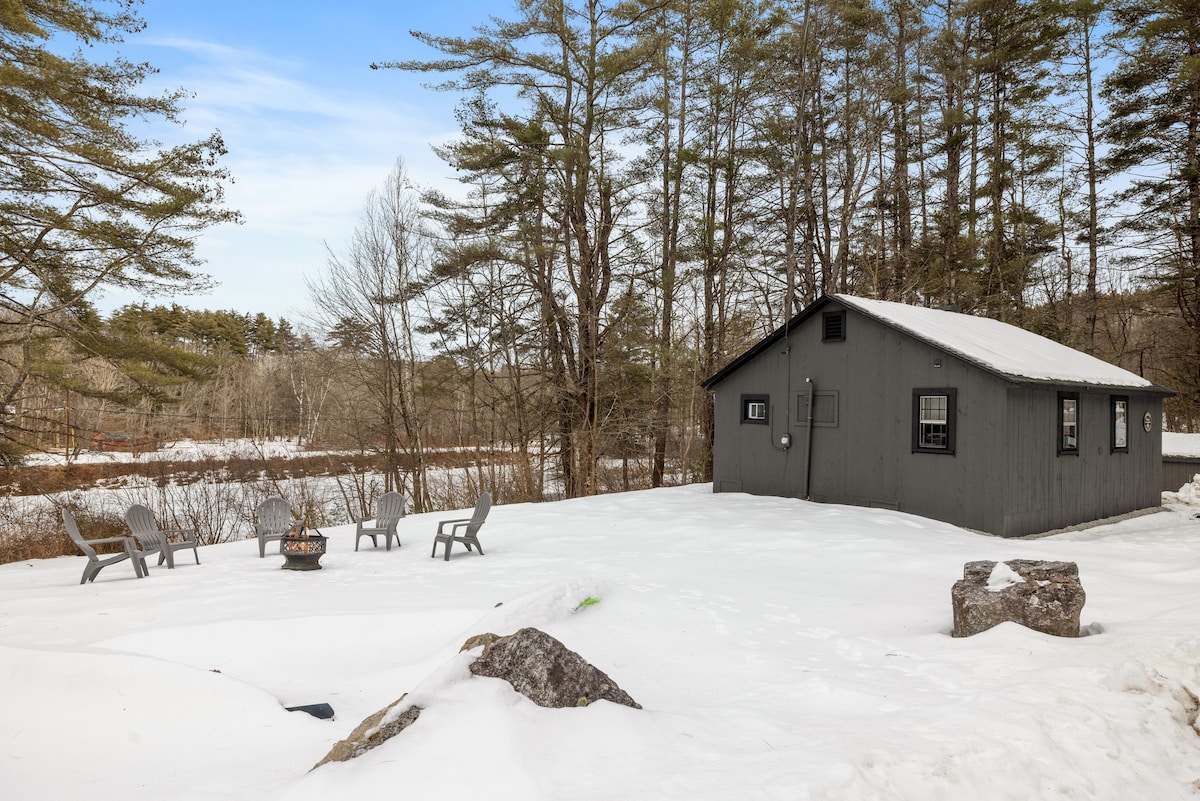 15 minutes to Pats Peak. Adorable, tiny New England towns! Small family restaurants 10 minutes. The wall of windows will encourage you to relax or play on the frozen lake and make s”mores @ the fire pit (wool blankets provided.). Cozy living room stocked with boards games, smart TV & DVDs. WiFi, full kitchen and full bath. Upgraded experience like linen sheets, echo home manual, espresso maker and satin pillow cases. 3 person max, no children, no smoking.