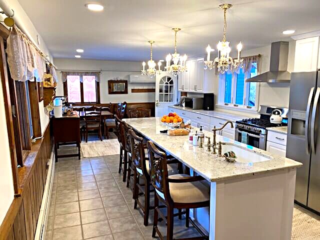 IMMACULATE COUNTRY HOME W/ FAST WiFi in fresh air New Hampshire. Snuggled in on a quiet street, yet steps away from DOWNTOWN, two "Mini Whole Food" markets! State-of-the-art gourmet kitchen fleshed out with organic spices, wares for entertaining, and other luxuries such as a rReverse Osmosis drinking faucet. Stunning sunlit water views and soothing water sounds! Beautiful antique furnishings and marble finishes add to the unique beauty of this New England home.