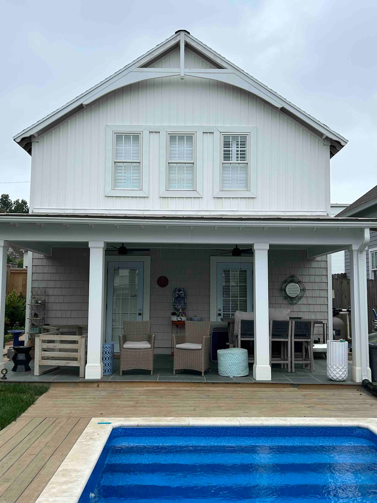 2 story 900 square foot Guest House. Living Room, Dining Area and Kitchen with Brick Floor. Upstairs there are 2 double beds, one is a built in with a memory foam mattress and the other is an antique painted white full size bed with a pillow top mattress. Flooring is laminate. Bathroom with shower. Private Porch off of bedroom. There is also a gas grill available for your convenience.