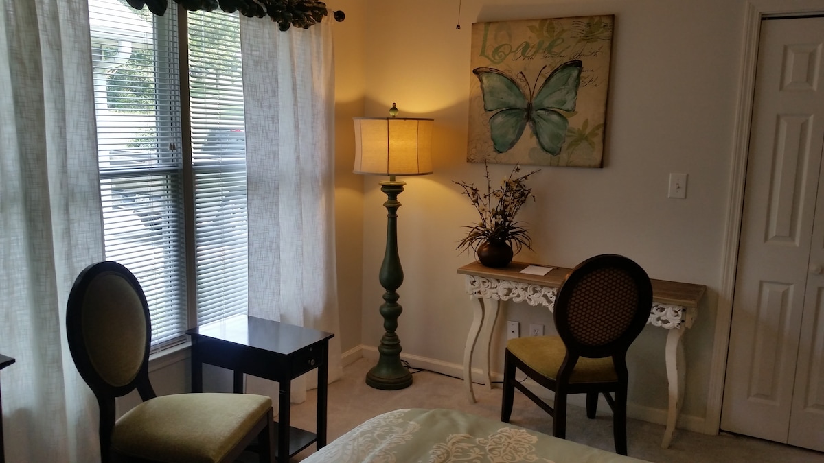 All the comfort of home found in this bright butterfly themed room on main floor with Queen size bed, sitting area, 32″ flat screen TV and private bath (shower only). Sleeps 2.