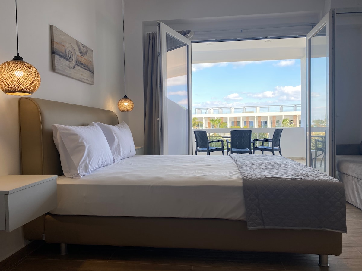 Αυτό το διαμέρισμα διαθέτει θέα στην παραλία ή στον κήπο του ξενοδοχειου. Περιλαμβάνει καθιστικό με καναπέδες-κρεβατια, τηλεόραση, καθώς και μικρή κουζίνα με εστίες μαγειρέματος,κουζινικά σκεύη, ψυγείο,ηλεκτρικό βραστήρα, τραπεζαρία. Προσφέρεται επίσης δωρεάν Wi-Fi. Διαθετει ένα υπνοδωματιο με 2 μονά ή 1 διπλό κρεβάτι, ντουλαπα, τουαλετα περιποιησης με στεγνωτηρα μαλλιών, χρηματοκιβώτιο, κλιματισμο και wc με ντουζιέρα.