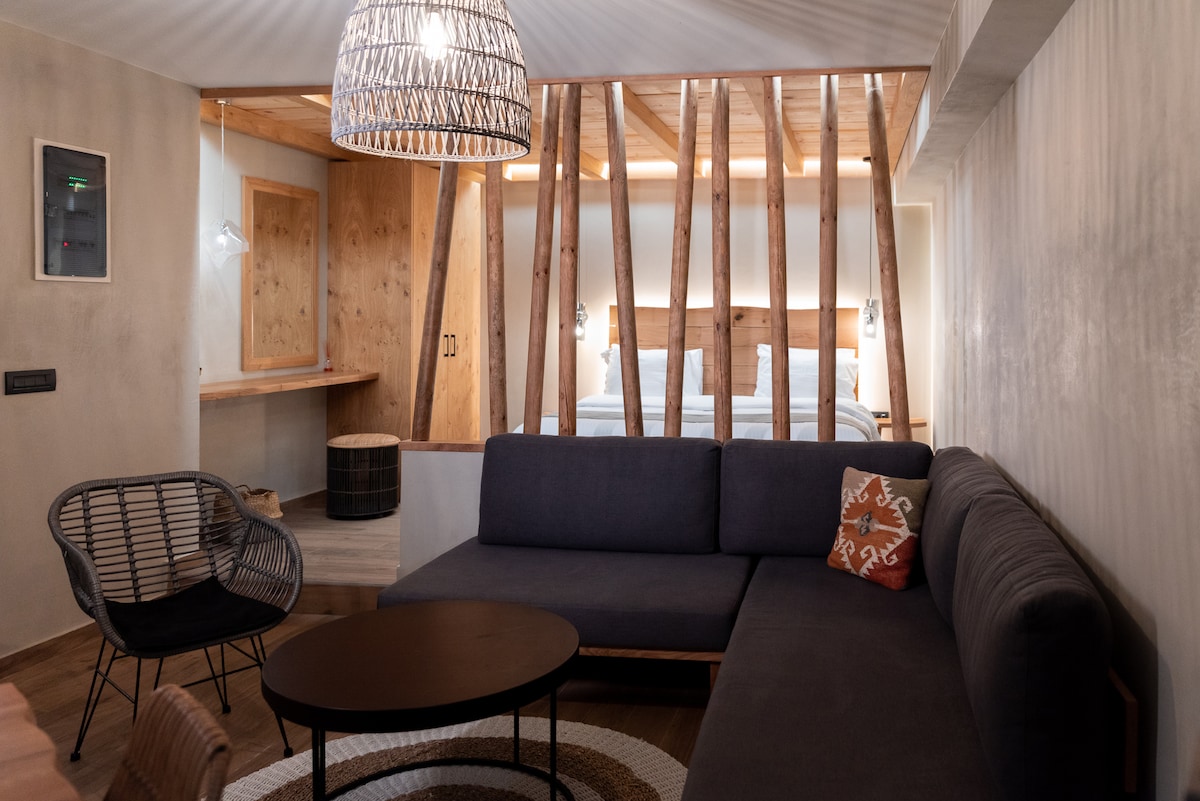 This stunning loft boasts a king-size bed atop a three-story building in Heraklion. Completely refurbished by an architect and interior designer, it features a generous modern living and dining area, a fully equipped kitchen, a workspace, and ample storage. The bathroom is highlighted by a spacious walk-in shower. Outside, a vast terrace offers abundant seating to unwind in the Cretan sunshine, ensuring privacy. Additionally, the apartment includes a fireplace for cozy winter evenings.
