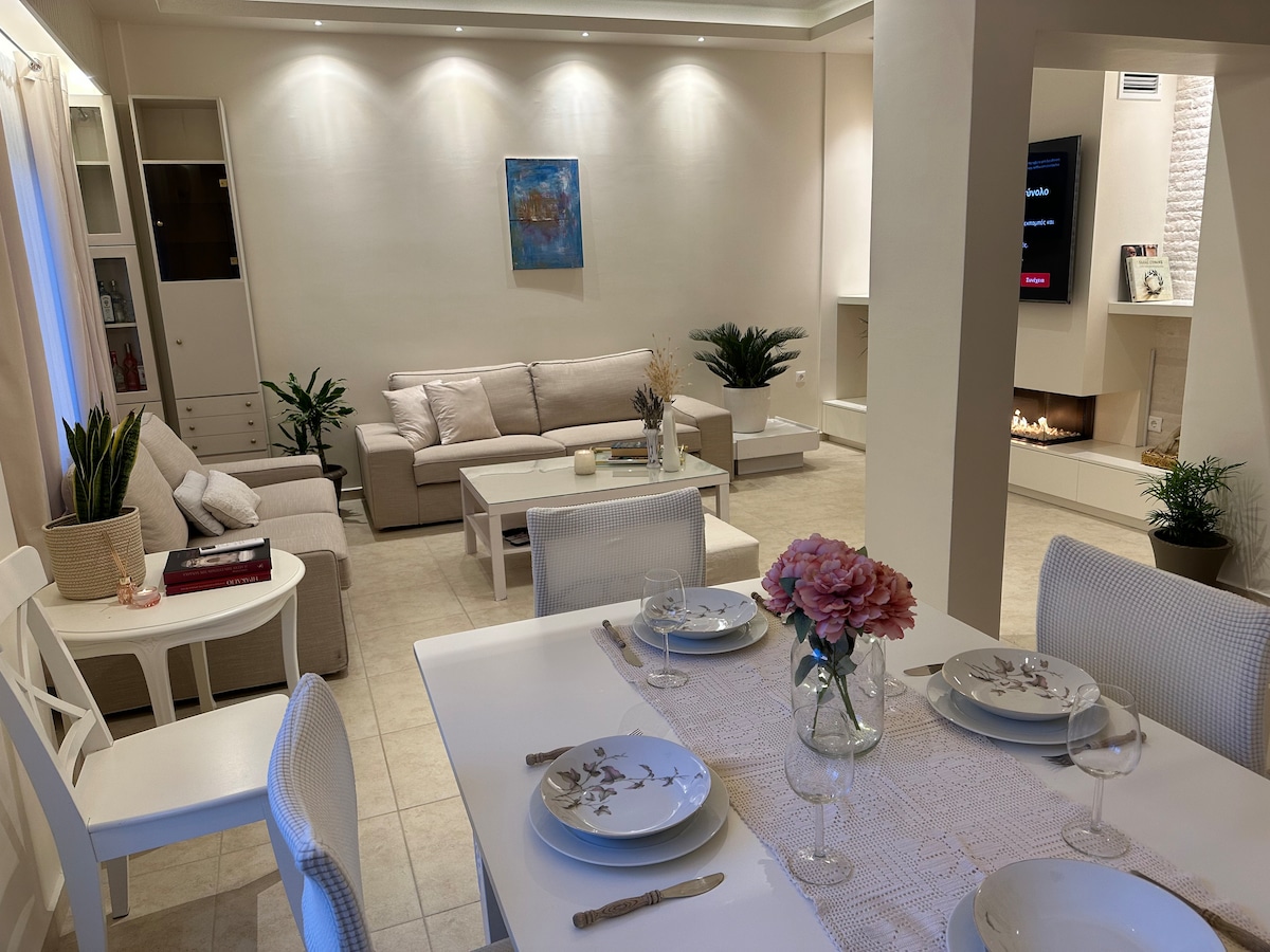 This stunning loft boasts a king-size bed atop a three-story building in Heraklion. Completely refurbished by an architect and interior designer, it features a generous modern living and dining area, a fully equipped kitchen, a workspace, and ample storage. The bathroom is highlighted by a spacious walk-in shower. Outside, a vast terrace offers abundant seating to unwind in the Cretan sunshine, ensuring privacy. Additionally, the apartment includes a fireplace for cozy winter evenings.