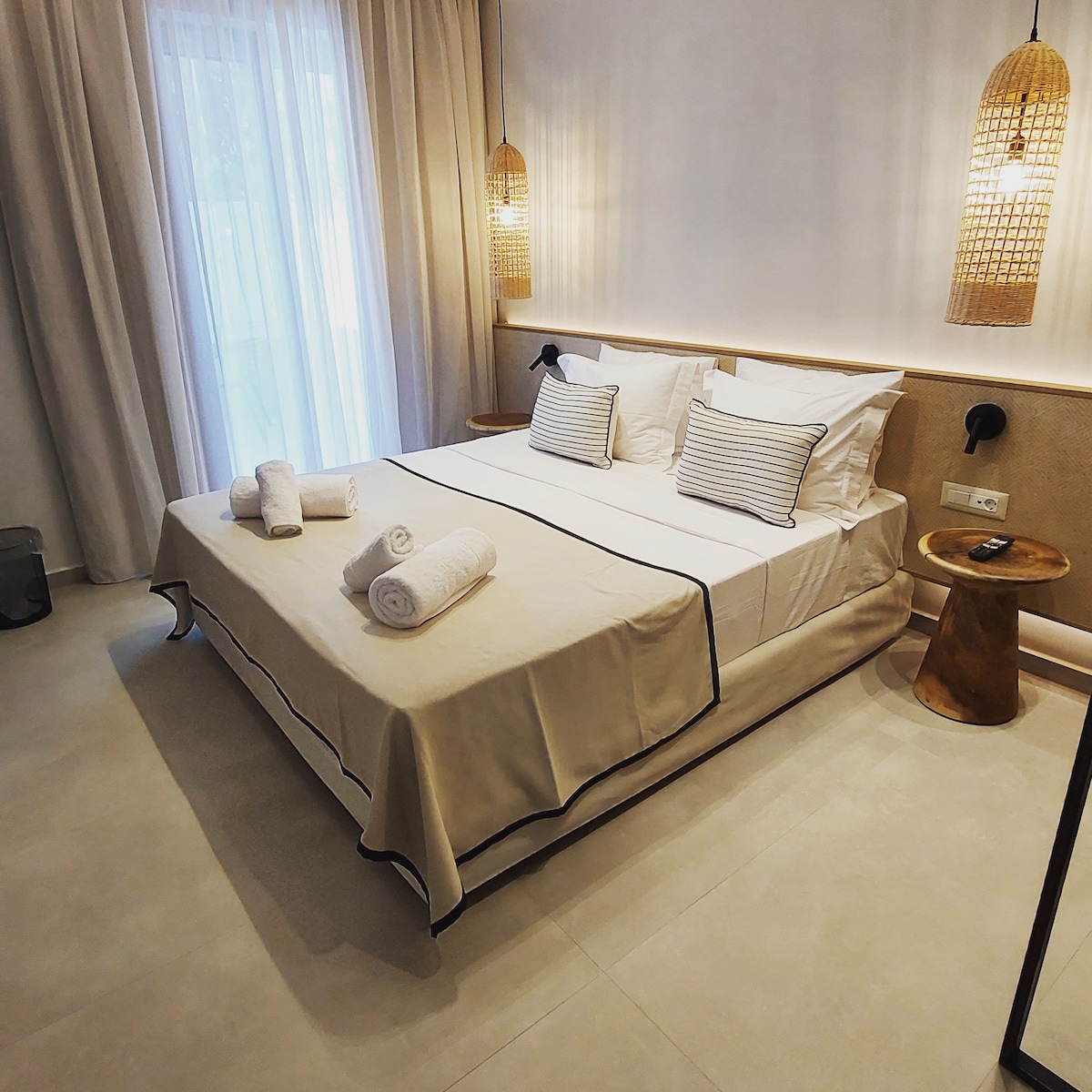 Simplicity And Hospitality. FULLY EQUIPPED APARTMENTS Ground Floor Standard Suite Ground floor standard suite with one bedroom and one living room can accommodate up to 5 guests with an extra bed. It is fully furnished and equipped with an air condition, kitchenette, fridge, TV, FREE Wi-Fi, a private bathroom and a big balcony or veranda offering views to the blossomed garden.