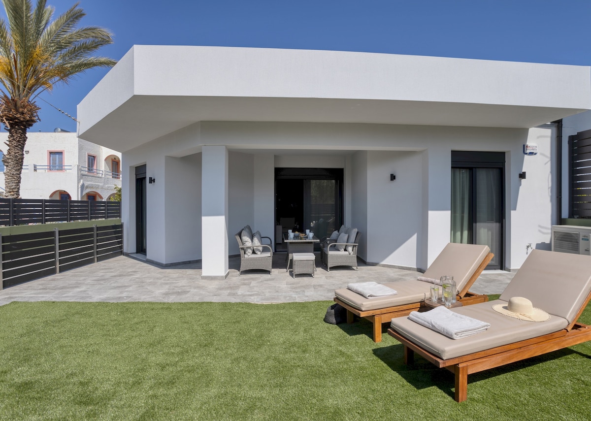 Escape to Seafront Suites, a private hideaway beside a celestial blue sea on Hersonissos stunning Beach Rivera. Nestled on a tranquil and secluded bay with panoramic views and sunsets that dazzle, the rest of the world does not exist, giving you freedom to release your inhibitions and live for the moment. More information Our luxury Suite with garden view is modern and minimalist with extremely comfortable guest rooms, earth tones and modern touches to soothe the mind and warm the soul.
