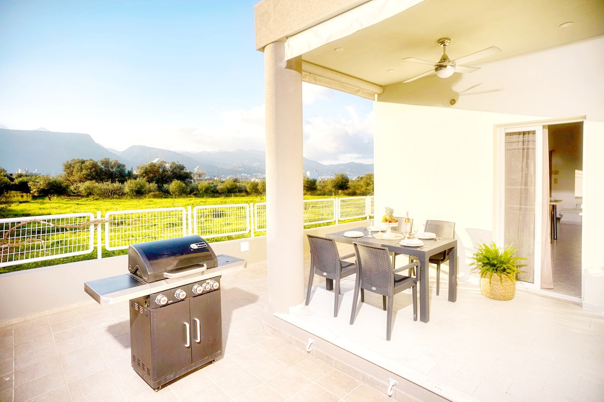 Our villa is located in a very quiet area, few kilometres (10minutes) outside Heraklion City. Enjoy the sun, the nature, our beautiful gardens and the private pool. Free parking spots , fully equipped kitchen and bathroom . Ideal for Families with kids. Can accommodate up to 4 people with 1 bedroom and one living room.