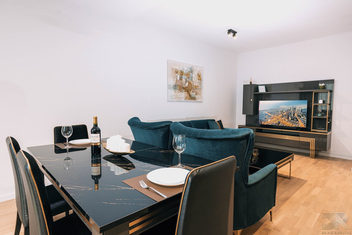 Welcome to your perfect getaway! This elegant and modern apartment offers a luxurious stay with its open-plan design, warm parquet floors, and chic furnishings. The spacious living area features a cozy sofa, stylish chairs, and a marble-accented wall with a smart TV. Enjoy natural light streaming through floor-to-ceiling windows, or relax with the privacy of soft curtains. The fully equipped kitchen is ideal for home cooking. Perfect for couples or business travelers.