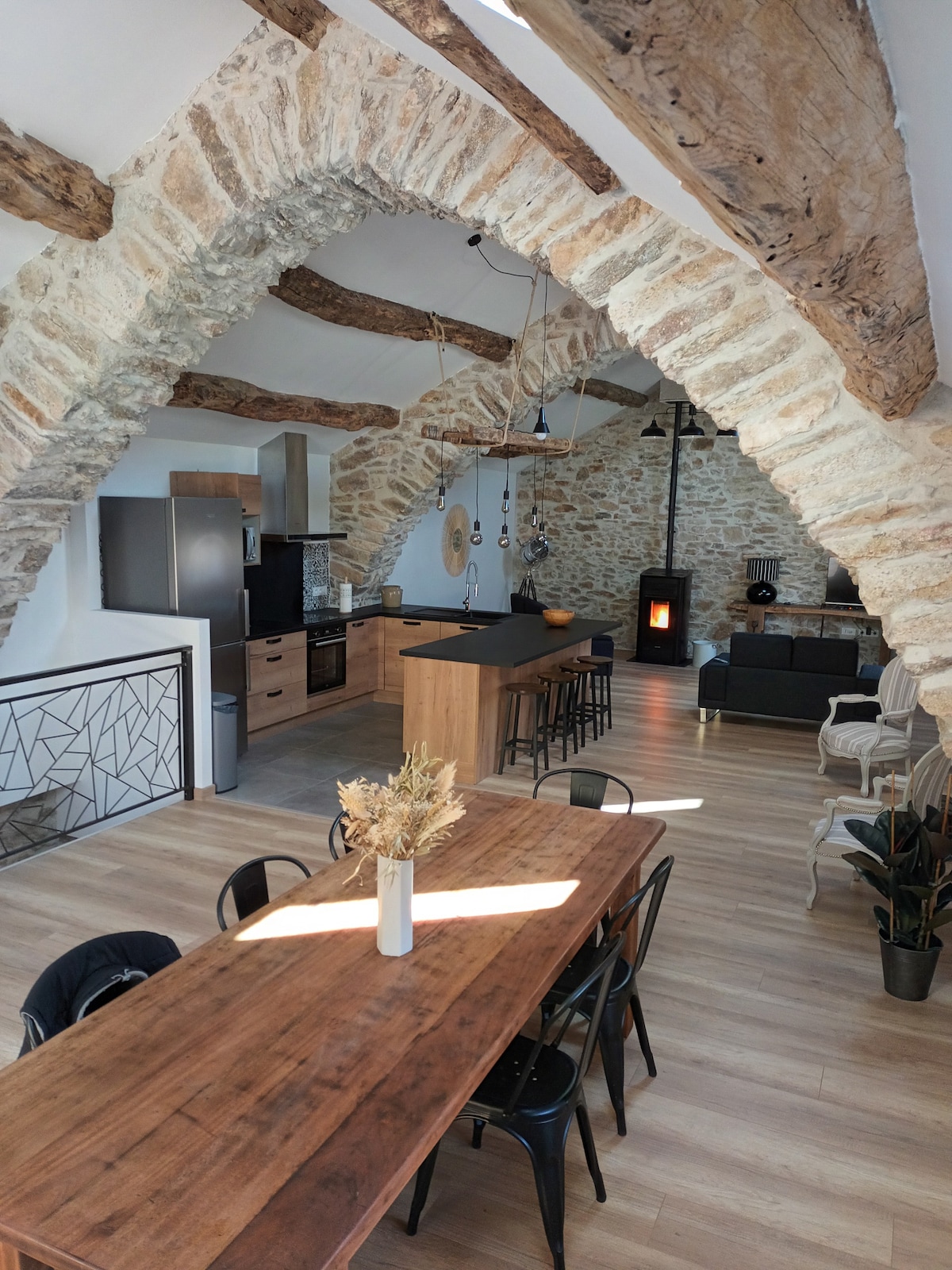 Vous serez accueilli au cœur du nature préserver dans une ancienne bergerie rénové en logements atypique. A l'étage une grande pièces vivre de 70 m2 ou se trouve un salon une cuisine équipée et un sejour. Plus un WC. Au rez de chaussée 3 chambres dont une suite parentale, une salle de bain et un WC séparé . Vous pourrez profiter a l'extérieur d'une grande terasse naturellement ombragé un sallon de jardin,plancha, terrain de pétanque.