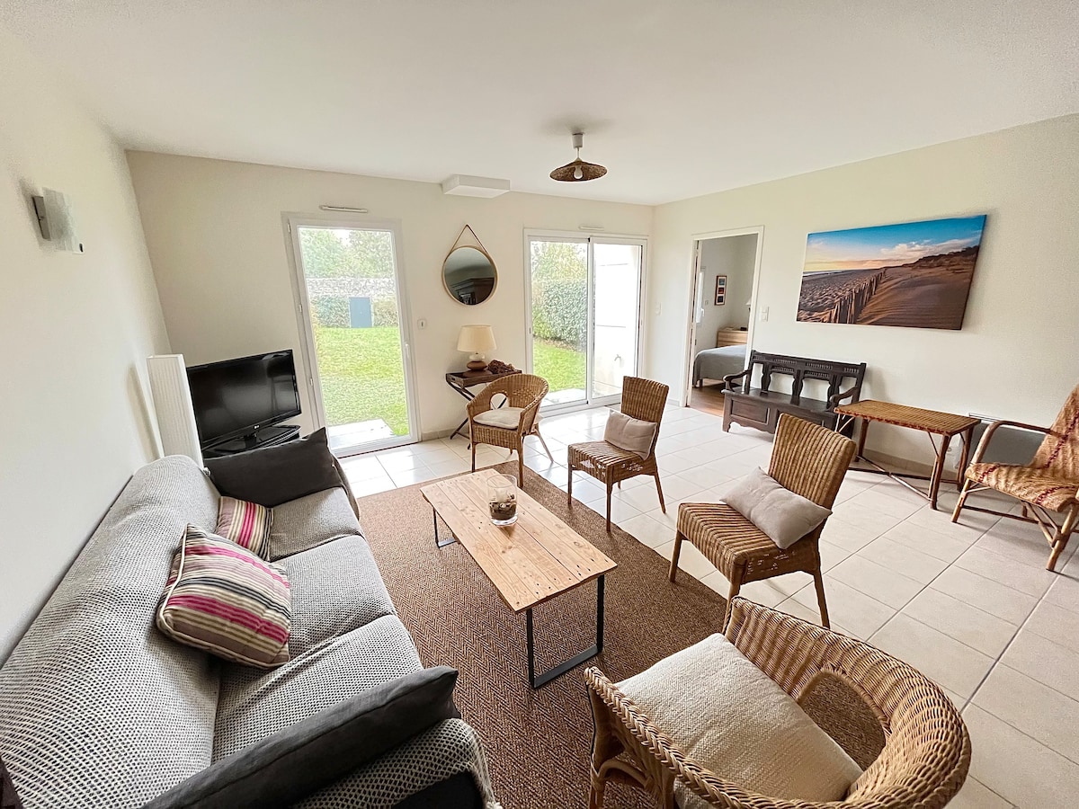 Partie de Chaumière Brieronne mitoyenne. Expo idéale pour profiter des extérieurs, avec jardin clos. Au rdc pièce de vie et wc avec douche (c'est pas la sdeB mais 1 plus, pour enfants/retour plage).escalier un peu droit pour accéder à l’étage sdeB ouverte, 2 Chambres communiquantes dont 1 plus petite sans fenêtre avec un lit de 140cm. Soit 50m2. Proche de la Côte, Guerande, la Roche Bernard, au Cœur de la Briere pour des balades en chaland. Le linge de maison est en supplément