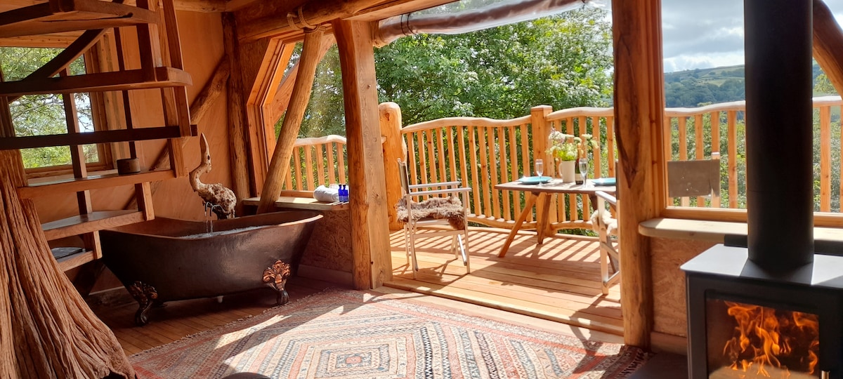 Goytree Glamping and Treehouses presents Bees Bower: From the beaten copper bath to the clay walls, this heavenly dwelling is a masterpiece of craftsmanship. Being part-cabin, part-tent, and part tree-house, positioned at the top of a copse, which descends over a stream into the valley and with birdsong by day and stars by night, this unique space will charm you. Perfect for romantic retreats, off-grid holidays with dogs or walking, exploring the local national parks and mountains beyond.