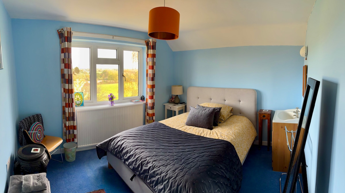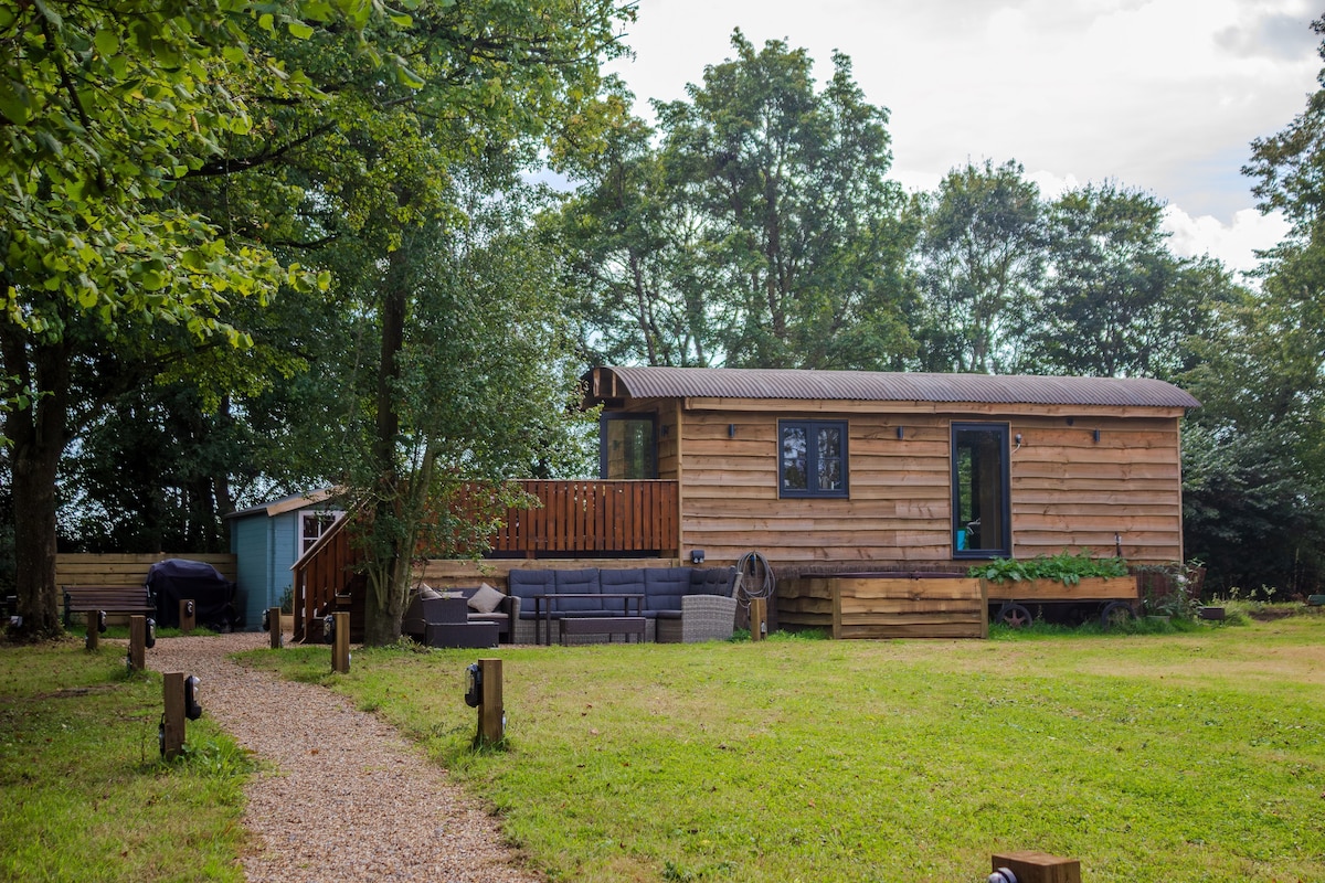 A peaceful hideaway set in its own secluded woodland area, within my one and half acre organic herb gardens and orchard. Downstairs you'll find a spacious open plan living area with fully equipped kitchen, dining area, and comfortable seating by the wood burner, with views to the fields behind and garden to the side. There's a bathroom with shower. Wake up to birdsong in the cosy double bedroom upstairs with wonderful views of the garden and fields from the velux windows.