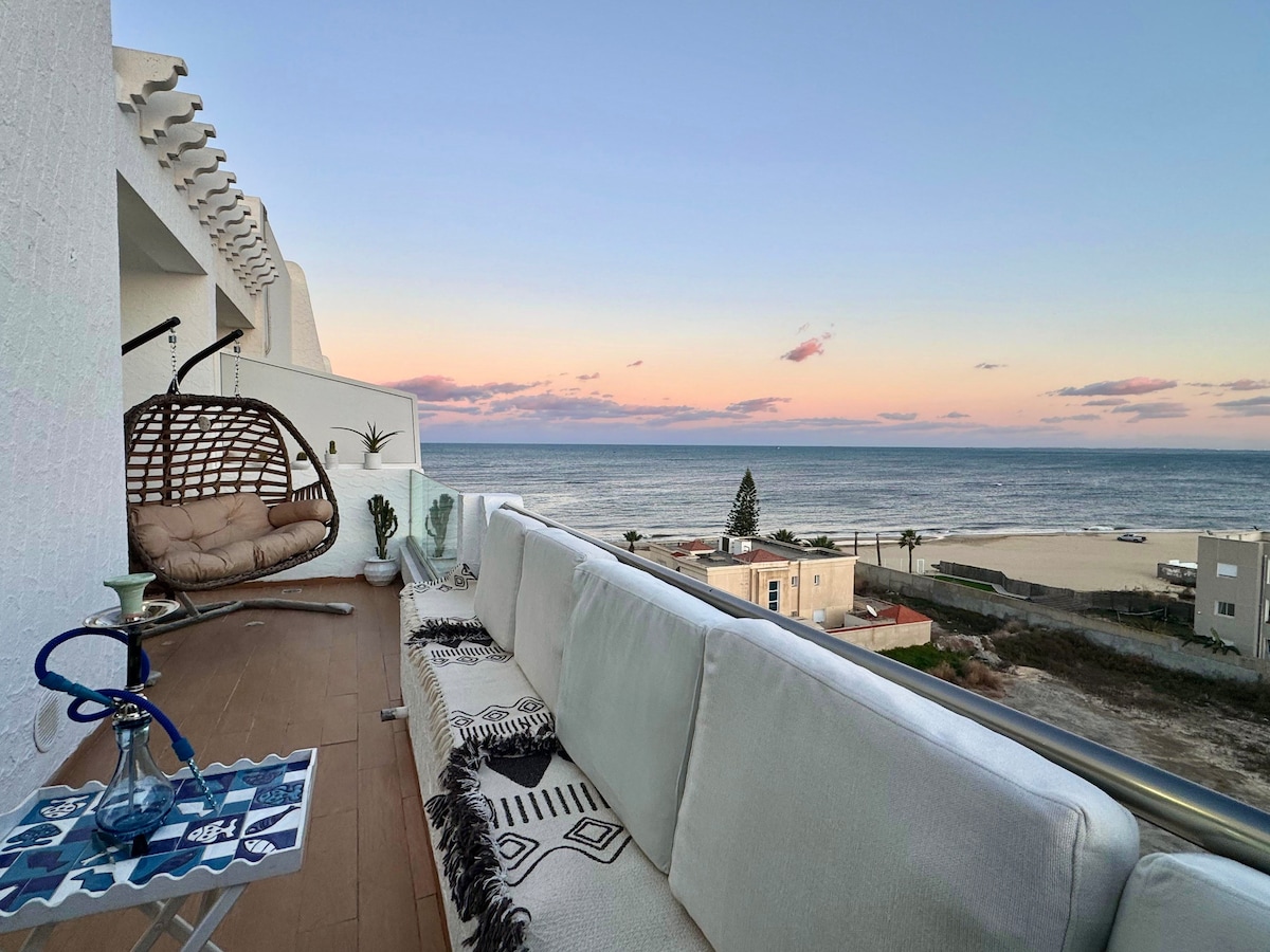 Un magnifique environnement naturel, une vue imprenable sur la mer, un grand appartement chaleureux et lumineux avec une vaste terrasse permettant d’admirer les vagues et fournie d’une chaise balançoire meuble et barbecue afin de bien profiter à l’extérieur . Notre appartement exceptionnel est situé au cœur de la région touristique à proximité du : port el marina kantaoui , golf parcours À 10min du centre d’achat mall of sousse Proche des hôtels,restaurants…
