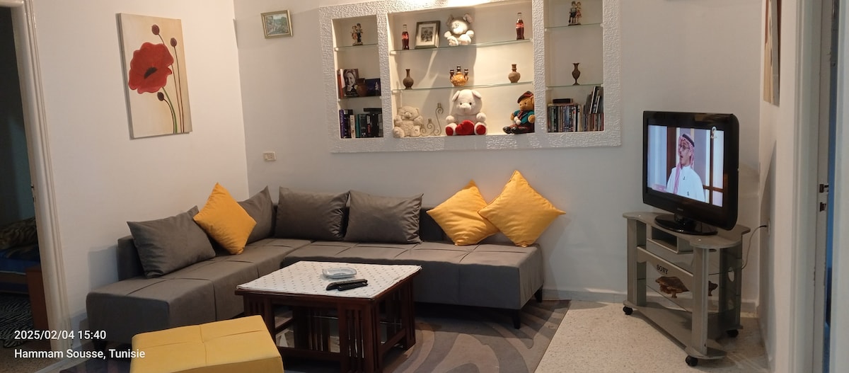 long stay discount 30% Cosy &Top Appartement Côté Mer, se compose à l'entrée d'une grande salle de séjour qui donne sur un beau jardin privatif bien décoré, tv chaines internationales, (TF1,M6 etc.), chambre à coucher à grand lit, salle de bain, cuisine bien équipée, climatiseur chaud et froid, avec une place de parking devant la résidence qui se compose uniquement de 6 appartements et près de toutes les commodités Bus, Taxi L'un de meilleurs choix pour Hergla