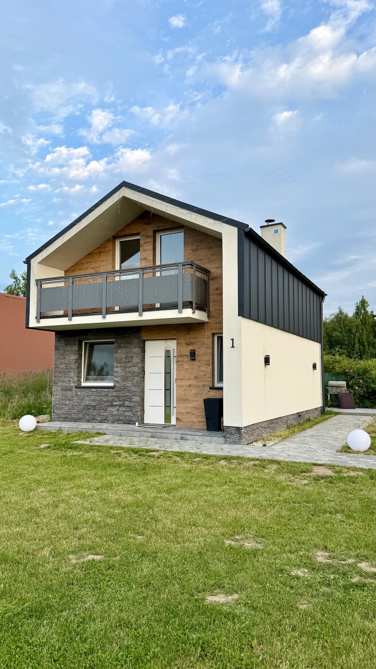 This is a beautiful, 175qm large luxury holiday house-built in 2016 on a 900 sqm large, fenced plot. It's located on WOLIN island (Western Polish Baltic coast),10km east from Miedzyzdroje. You can find here an absolute tranquility.The house is located 50m from Wolin National Park (a great forest) and 1,2km through this forest to the beach. The beach itself: wide, wide, long, white sandy beach. In the house: a fire place+ sauna and 5 bed rooms (4 x double bed + 1 room with 2 bunk beds for kids)